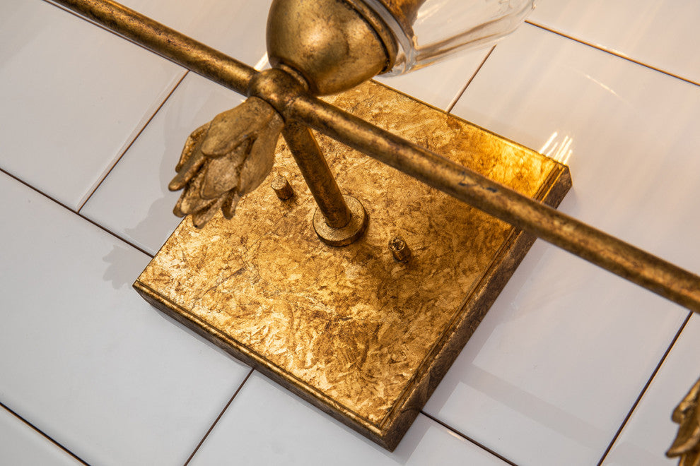 Drawing inspiration from a classic design, this antique gold 3-light vanity light is the perfect pick for any contemporary or traditional space. This fun finial design showcases a simple, rectangular 5" square backplate, dome shaped glass shade, and a decorative unique flame-shaped gold finial. Easily installed over your mirror, this two-light sconce is suitable for damp spaces, and is finished in a beautiful antique gold.Number of Bulbs: 3Bulbs Included (Y/N): NoWattage: 60w MedShade Finish: GlassShade Included (Y/N): YesUL: NoETL Damp Rating: Yes