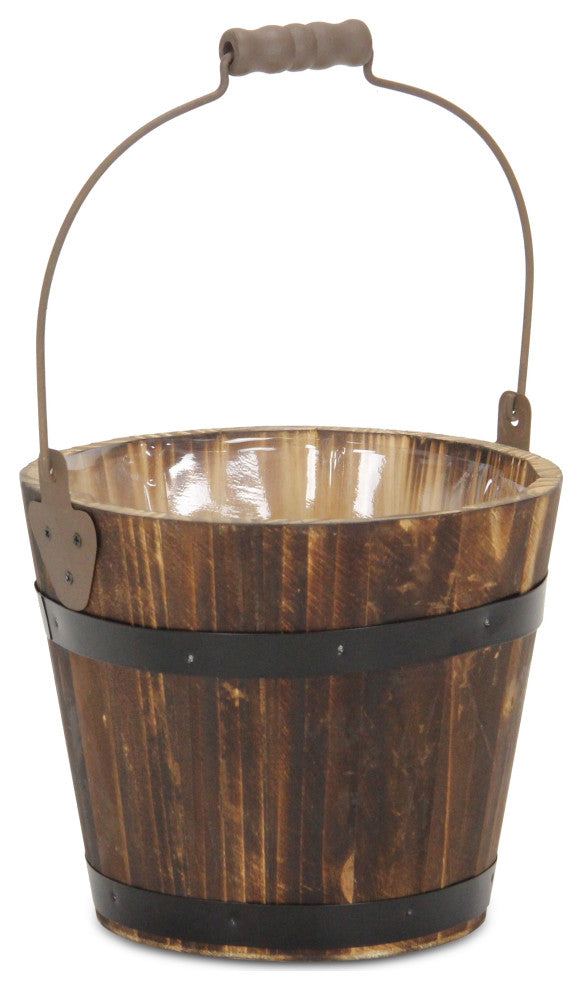 Enhance your garden or patio space with the Wooden Garden Pail. Simple yet charming, the Wooden Garden Pail is sleek in design and the perfect addition to your outdoor space. Crafted from natural wood, the Wooden Garden Pail features striking metal accents and a black wood handle grip. Whether you utilize this garden pail for storage, or simply as a decorative accent piece, the Wooden Garden Pail will effortlessly elevate your garden decor.-An entirely handmade and hand crafted design-Fully assembled and ready for use, simply unbox and display!-This piece is made from a complementary blend of wood and metal materials-Features a tapered, round shape-Includes a plastic liner to pair with live plants-Incorporates a center swivel handle with a wood gripMeasurements: -Dia: 6.75" x Base: 5" x H: 5.75" x Total Height With Handle: 12"- Interior: Top Dia: 6.12" x Bot Dia: 4.25" x H: 5.5"