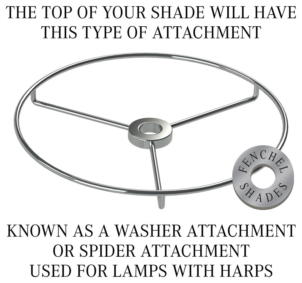 This Fenchel Shades lamp shade has a top diameter of 6 inches, a bottom diameter of 15 inches, and a slant height of 8 inches. The vertical height of this shade is about 6.5 inches. This attachment is called a washer attachment and is nickel in color. It is also known as a spider attachment. If your lamp has a harp, then you will generally need a washer attachment. The hole size (inner-dimension) of a washer attachment measures slightly under 1/2 inch. The drop on this particular attachment is 1/2 inch. That means, it recesses about 1/2 inch below the top of the lamp shade. This Product is proudly made in the USA with US materials.