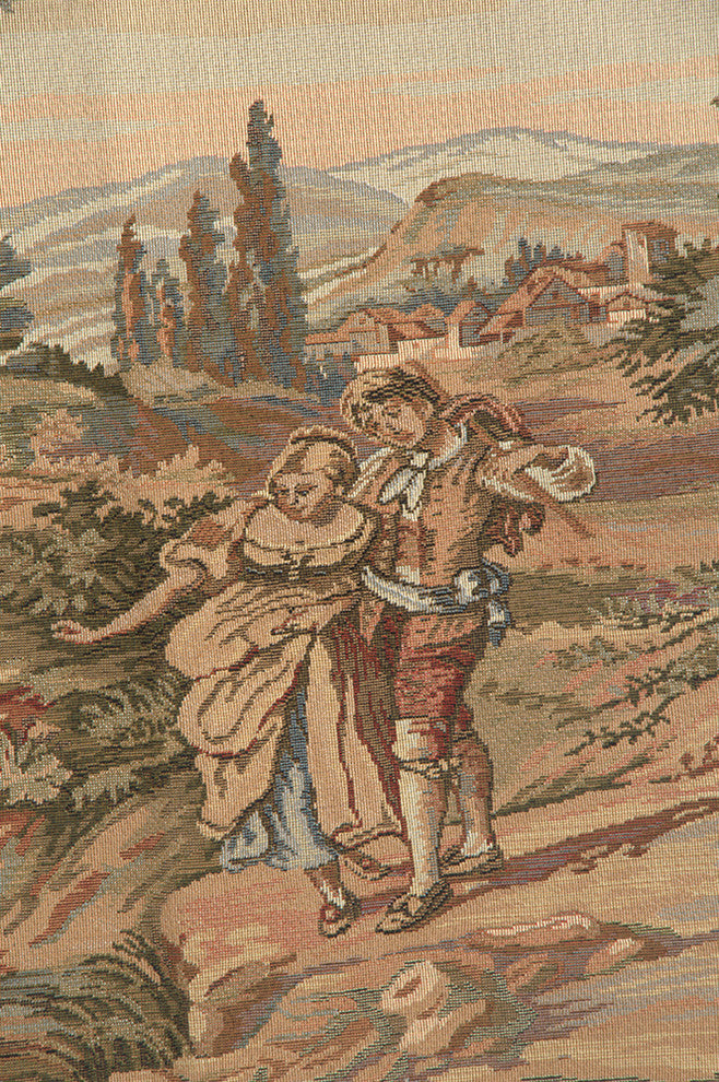 Long before highways and byways coursed their way across the European landscape, travelers relied on the vast network of waterways to get from one village to another instead. Small ferries crossed the small rivers and canals regularly, transporting passengers and goods up and down stream. Here, a lady and gentleman get ready to embark on a journey aboard a small ferry. The lad in the boat steadies it with a long pole as the damsel starts to step in. Beyond, one of the many locks that controlled flooding can be seen under an archway. This tapestry is a beautiful reminder of days gone by when needs were so much simpler.