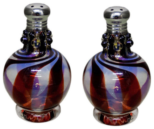 These beautiful hand blown salt and pepper shakers add an elegant touch to any dining table. Available in many colors and designs, each piece is completely unique. Perfect for table decorations or hostess gifts. Please note each shaker is handmade so there will be slight variances between the shakers you receive and the one pictured.
