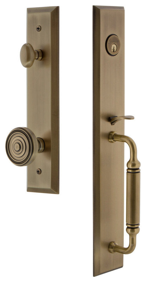 The simple, straight lines and tailored outer edges provide a custom look to your door giving it a broad appeal for almost any home. The Fifth Avenue One-Piece Handleset is available with any Grandeur Hardware knob and lever. Offered in the following Grandeur designer finishes to help you mix and match your door hardware: Vintage Brass, Antique Pewter, Satin Nickel, Timeless Bronze and Lifetime Brass.
