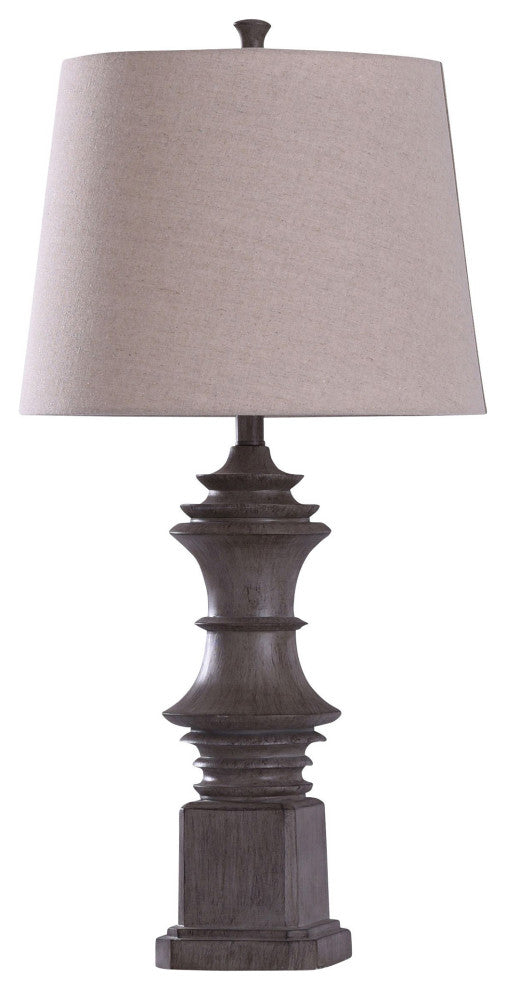 A rustic table lamp that brings natural influence to living rooms, dining rooms and foyers. The skillfully designed polyresin frame features a dark wood grain finish, giving this traditional lamp a large dose of naturalism. The tan shade consists of linen and polyester, offering a nice complement to the table lamp�s strong frame and emphasizing the fixture�s farmhouse design.
