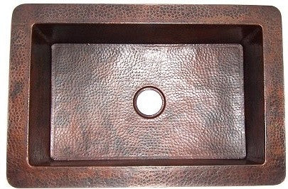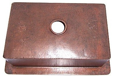 This kitchen copper sink has a standard 3.75 diameter hole in a single compartment. The upper border is 2.5" wide all the way around it. The bowl measures 28" length by 17" wide by 9" deep. This hammered kitchen copper sink is a beautiful piece of art. From a copper sheet the wise artisan hands transform it into this unique piece. The hammer footprint is very visible, giving it its own character. The reddish/oxidated texture is characteristic of natural copper when it is cooled down from red-hot temperature using cold water, that specific characteristic is what makes it so beautiful.This copper sink was mostly raised with the artist hammer. The techniques used by Santa Clara del Cobre craftsmen is the same one used for several centuries, where no power tools are used, just the furnace to heat the copper and a hammer to give it the shape. The finish is in a dark brownish color. Along your home decoration, this piece it will add a unique touch to your kitchen making it a very special point of attraction.This copper sink will not rust or become greenish because the patina will protect it from humidity and oxidation, just keep it as dry as you can to preserve it longer with the current color textures. The patina can be damaged faster if any abrasive substances stay for long periods of time on the sink surface, because of this, washing it after usage is recommended; besides that, no more maintenance is required. The copper sheet is 14 gauge (0.064" thickness)."Hand-hammered and mold-cut to perfectionHandcrafted by Mexico''s Finest ArtisansWe include 1" long brown screws in all of our hammered copper switch plates