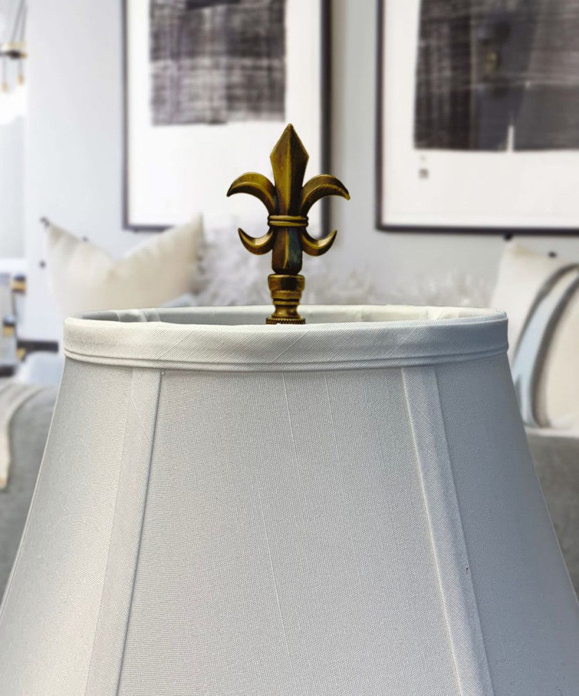 A new Fleur De Lis lamp finial is the perfect way to complete your new or favorite lamp. Modeled after a lily flower, the Fleur De Lis symbolizes : Perfection, Light, Purity and Life. Place this finial atop your favorite lamp will keep you continually aware of its influence. A new lamp finial is the perfect way to complete your new or favorite lamp. Quality finial that is sure to dress up your tired lamp. Finials have a standard 1/4"-27 thread, which will fit the harp on almost every lamp. (This means the opening is 1/4" wide and there are 27 threads per inch.) 95% of all lamp harps will fit this finial. Material: Antiqued Brass finish with Antiqued Brass Base. Finial measures 3.2" height x 1.75" width. FLEUR DE LIS DESIGN - 3.2" height x 1.75" width Fleur De Lis lamp finial. Modeled after a lily flower, the Fleur De Lis symbolizes : Perfection, Light, Purity and Life. Place this finial atop your favorite lamp will keep you continually aware of its influence. A perfect French design to top off your table or floor lamp.ANTIQUE METAL FINISH - Antique Metal finish will match most lamp harps and home decor. Not hollow like some finials. Material: Antiqued Brass finish with Antiqued Brass Base.PERFECT SIZE - Proportional sized to fit most standard table or floor lamps. Finial measures 3.2" height x 1.75" width.FUNCTIONAL - Secures your lampshade to standard table or floor lamp, while upgrading the style. A new finial will personalize the lamp to reflect your personality.EASY TO USE - Easily screws on/off. Finials have a standard 1/4"-27 thread, which will fit the harp on almost every lamp. (This means the opening is 1/4" wide and there are 27 threads per inch.) 95% of all lamp harps will fit this finial.