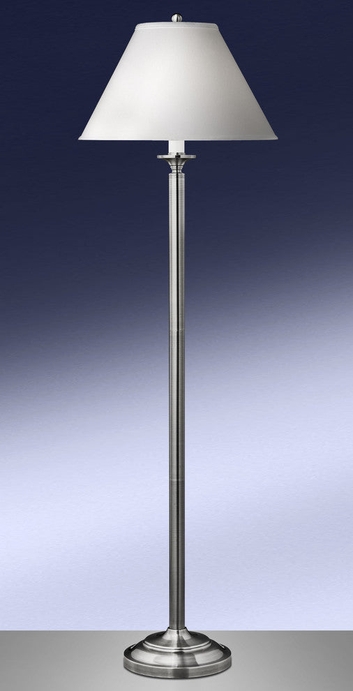 Standard Lamp Specifications for #PT1492:Product Type: Floor LampHeight: 60"Finish: Brushed SteelConstruction: SteelSocket: (1) Aluminum On/Off Med. Base Type A 150W Max socket(s). (Bulb not included)Switching: (1) On/Off Push-through switch(es) located on the socket.Cord: 8'' (from base) long clear silver SPT-2 cord set with a 2 prong polarized plug.Electrical Outlet: None.Data Port: None.USB Port: None.UL/CUL and/or ETL listed: YesHarp Size: 9 inches (including the saddle)Standard Packing: 1 per carton (shade packed separately).Lamps & Shades per SKU: 1Lamping: (1) Aluminum On/Off Med. Base Type A 150W Max socket(s).Shade Size and Description: White lenore fabric laminated to styrene hardback with self fold trim measuring 7" x 17" x 11" w/1" drop (Top x Bottom x Slant).Bulb Included: NoMaterial Description: constructed from polished, plated, and lacquered steel.