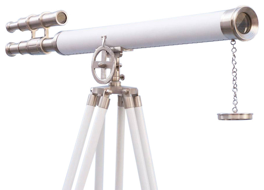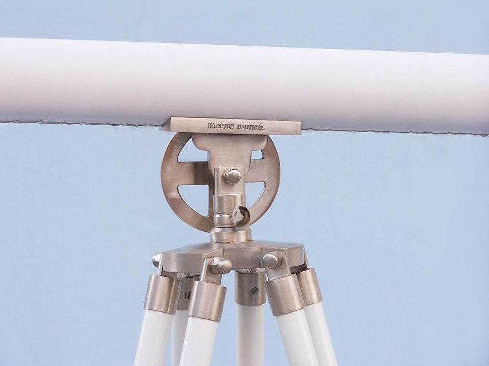 The Hampton Nautical Floor Standing Brushed Nickel With White Leather Griffith Astro Telescope 65" with view finder is the pinnacle of our wide telescope selection. This beautiful brushed nickel telescope is mounted on a wooden tripod. This telescope is a beautifully functioning nautical masterpiece, with a 42mm objective lens that produces up to 15x magnification.Focusing is accomplished by adjusting the eyepiece ring on the telescope tube and a removable brushed nickel cap, connected by a chain, protects the objective lens.--The wooden tripod stand features smooth, polished and round legs, each with brushed nickel fittings and a screw release to let you adjust the height. A brushed nickel chain holds the three wooden legs together to maintain the telescope''s position.--Dimensions: 65" H x 25" W x 32" L---- 15X Magnification-- Brushed Nickel telescope body-- Glass optics for a clear view (not plastic lenses)-- Fully functional telescope focuses and magnifies-- Sturdy wooden tripod supports telescope when standing-- -- Custom engraving/photo etching available: Logos, pictures, or slogans can be easily put on any item. Custom engraving available on large quantity orders (call us for information)--
