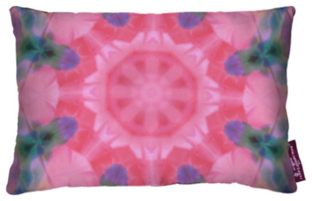 Colors flourish within a fantasy. A dazzling fractal design reminiscent of Indian Batik textiles. Bring a flair for the exotic into your décor with this whimsical accent pillow. Flower Child is made from silk charmeuse with a velvet-textured backing. Fill: 75% goose down; 25% feather. Handmade by designer Joe Ginsberg in New York.