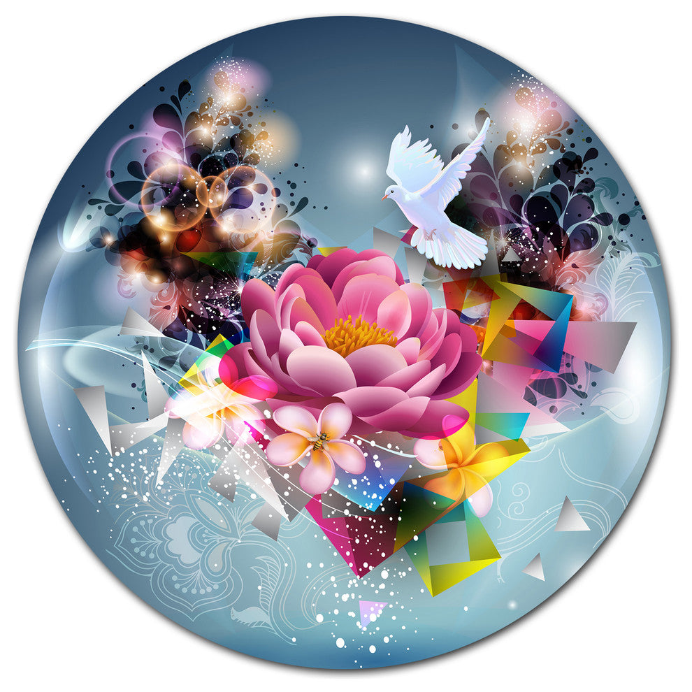Bring Contemporary Abstraction to your home with this large Circle Metal wall art. This Flowers and Dove Abstract Design Metal Artwork makes it the focal point of any room or office.