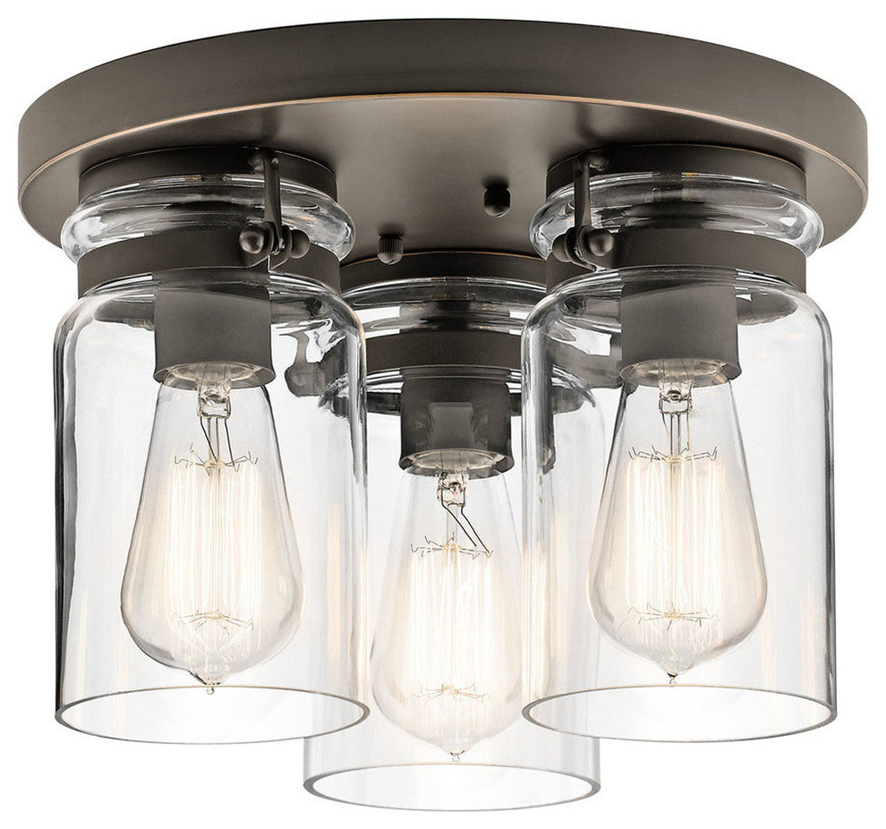 The vintage style of this 3 light flush mount ceiling light from the Brinley collection gives a beautifully modern treatment to the familiarity and comfort of canning jars. Used in groups or stand-alone, the Brinley collection is a new touch of home in Olde Bronze.