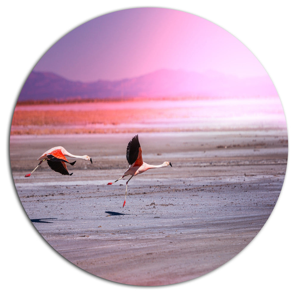 Flying Pair Of Cute Flamingos, Animal Round Metal Wall Art, 23"