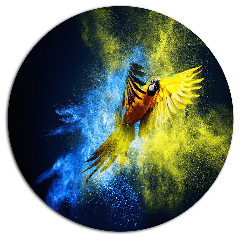 Bring Contemporary Abstraction to your home with this large Circle Metal wall art. This Flying Parrot over Color Burst Metal Artwork makes it the focal point of any room or office.