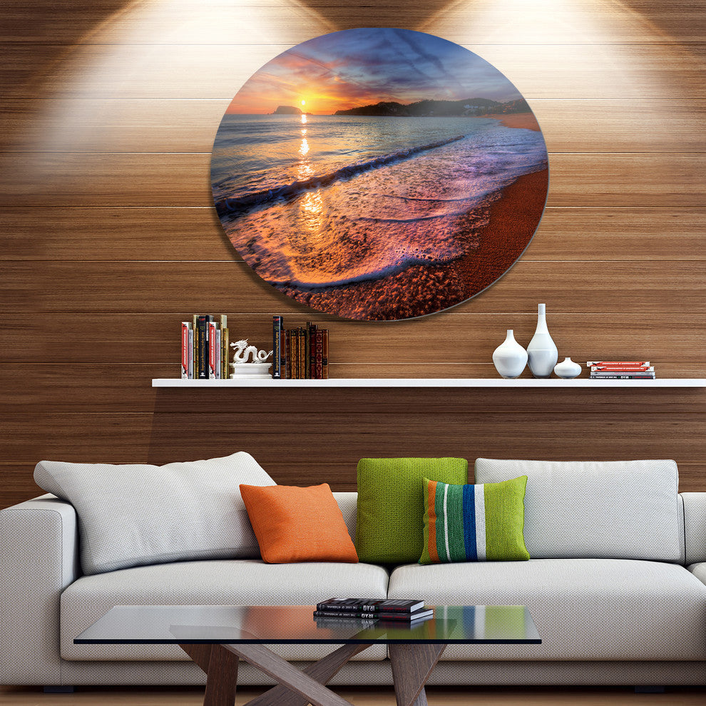 Bring Contemporary Abstraction to your home with this large Circle Metal wall art. This Foaming Waves at Beautiful Sunset Metal Artwork makes it the focal point of any room or office.