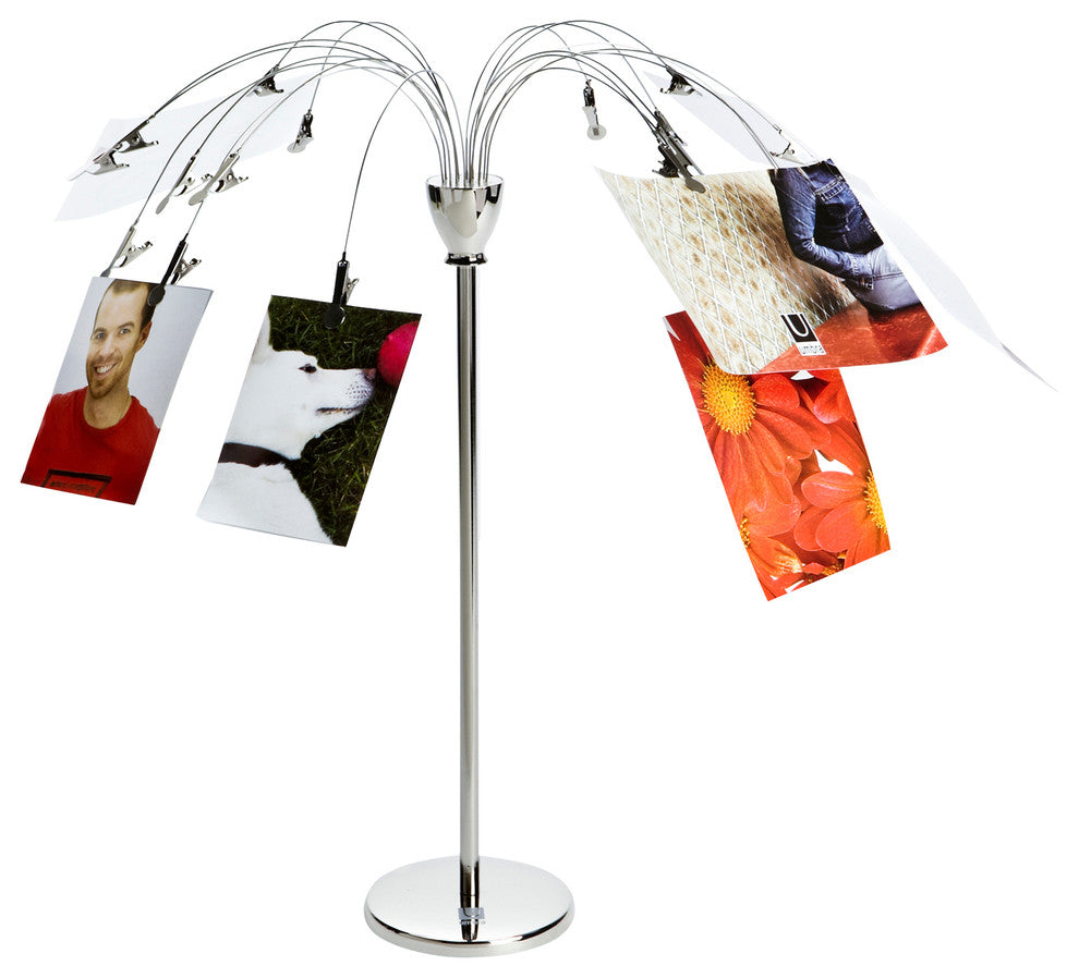 -Plated wire and clips with metal weighted base.Freestanding desktop photo tree holds 18 photos/notes on clips.Freestanding desktop photo treeEasy assemblyHolds 18 photos or paper artPatents: US Patent No. -7,788,836, US Patent No. -D530,102, CND IND. -DES. -REG. -No. -115459, CND Pat. -No. -2539949, EU Design No. -000509971-0001Dimensions: 14 x 17"