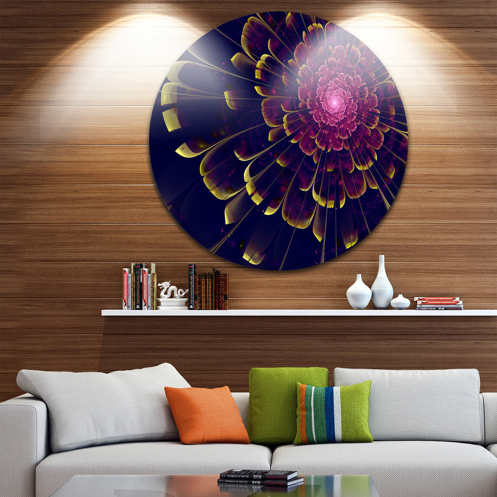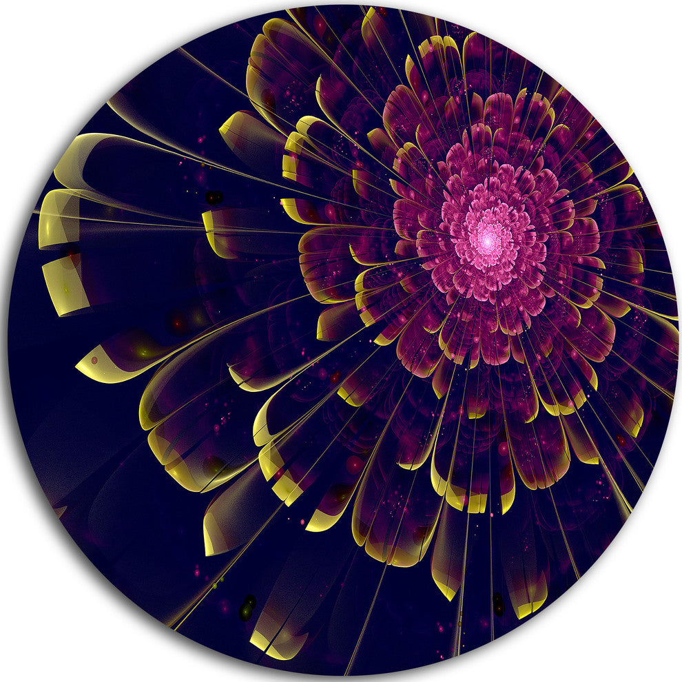 Bring Contemporary Abstraction to your home with this large Circle Metal wall art. This Fractal Flower with Yellow Details Metal Artwork makes it the focal point of any room or office.