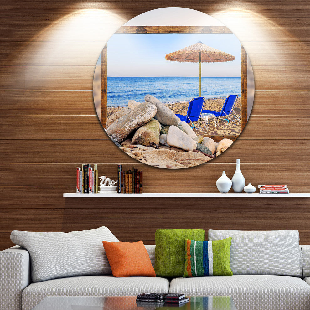 Framed Beach With Chairs, Umbrella, Seashore Round Metal Wall Art, 11"