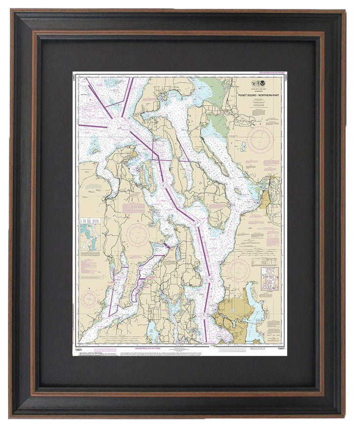 This Framed Nautical Map covers the waters of Puget Sound; Northern Part. The Framed Nautical Chart is the official NOAA Nautical Chart detailing these waterways of Washington State.