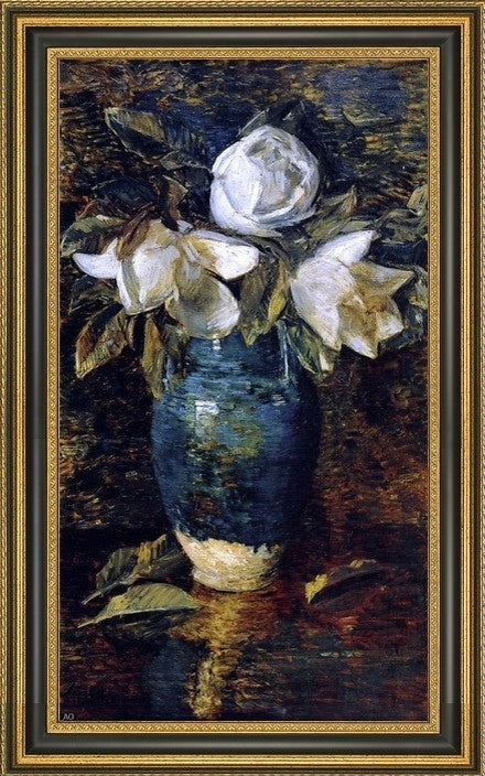 14" x 28" Frederick Childe Hassam Giant Magnolias framed premium canvas print reproduced to meet museum quality standards. Our Museum quality canvas prints are produced using high-precision print technology for a more accurate reproduction printed on high quality canvas with fade-resistant, archival inks. Our progressive business model allows us to offer works of art to you at the best wholesale pricing, significantly less than art gallery prices, affordable to all. This artwork is hand stretched onto wooden stretcher bars, then mounted into our 3 3/4" wide gold finish frame with black panel by one of our expert framers. Our framed canvas print comes with hardware, ready to hang on your wall. We present a comprehensive collection of exceptional canvas art reproductions by Frederick Childe Hassam.