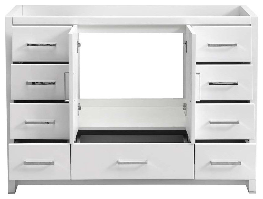 With its elegant White Gloss finish, the Fresca Imperia Freestanding Modern Bathroom Cabinet is the perfect complement to a contemporary space. Two doors open to reveal a spacious storage area for keeping toiletries, towels or other bathroom essentials handy. There''s a roomy drawer beneath it and eight deep side drawers, for total organization. The doors and drawers are fitted with top quality soft-closing hardware. Polished bar-style chrome handles add to the chic design.This lovely cabinet will enhance any decor and is available in multiple sizes. It includes installation hardware.Dimensions of Cabinet: 47.3"W x 18.4"D x 34.3"HMaterials: Constructed Using the Highest Grade MDF, Engineered for Moisture Resistance2 Soft Closing Vanity Doors9 Soft Closing Drawer w/ DTC Rail SystemIncluded: Base Cabinet and Installation Hardware