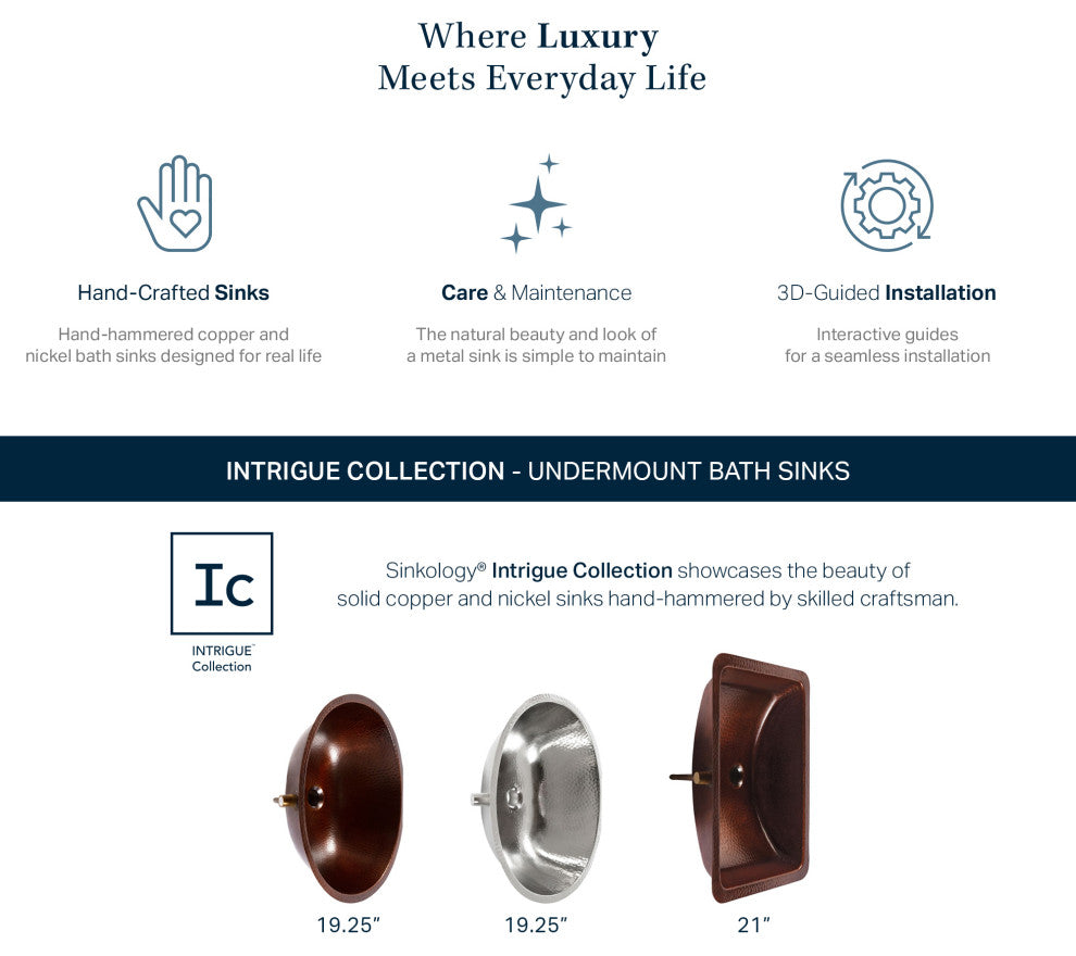 Traditional beauty doesn"™t always come with modern features. The Freud undermount copper bath sink combines a classic design with a modern undermount style. The built-in overflow system sets your mind at ease by ensuring the water stays in the bowl - where it belongs. Our durable, solid copper bathroom sinks are hand-hammered by skilled craftsman and protected by our lifetime warranty.Dimensions: 19" x 15.5" x 6.875"Undermount style creates a seamless transition from sink to countertop Built-in overflow system prevents water from completely filling the bowl and overflowingHand-hammered, solid 18-gauge copper is protected by our lifetime warrantyAged Copper is a warm and vibrant finish with an all-over patinaRecommended Products: SinkSense 1.5" Pop-Up Sink Drain in Aged Copper "“ Overflow (#TP01-AG-OV)Copper Care IQ Kit (#SARMOR-101)