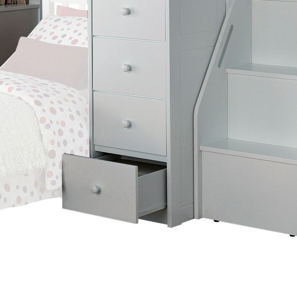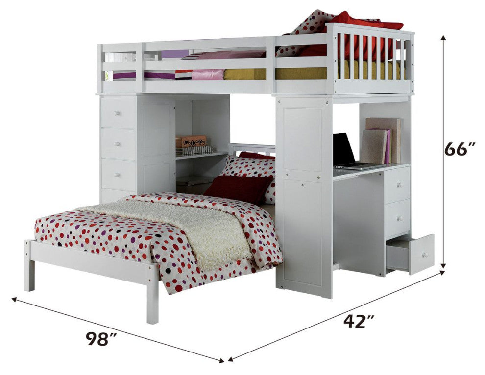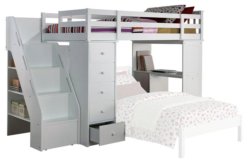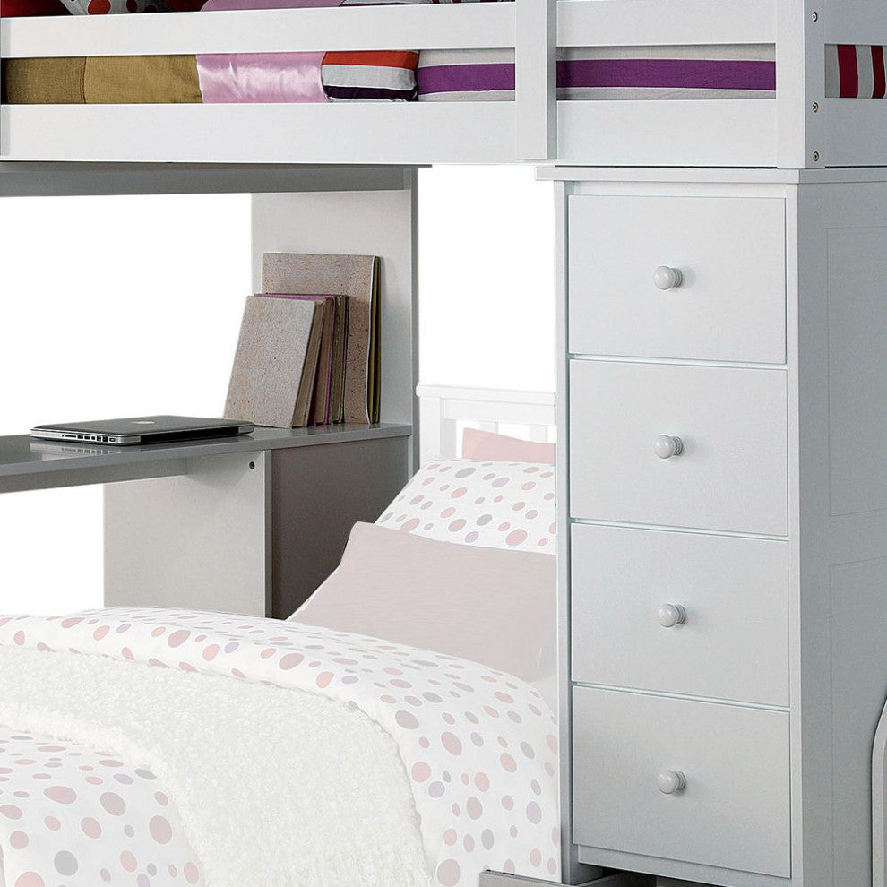 The Freya Loft Bed and Bookshelf Ladder, shown here in white, features a workstation, multiple storage functions and a bookcase ladder. The desk has three drawers, and the chest has five drawers. The bottom twin bed is sold separately. The bookcase ladder is right-facing. A bunkie board is not required.Bookcase ladder measurements: 19" x 35" x 59"HTwin bed measurements: 75" x 42" x 24"H 16-piece slats included