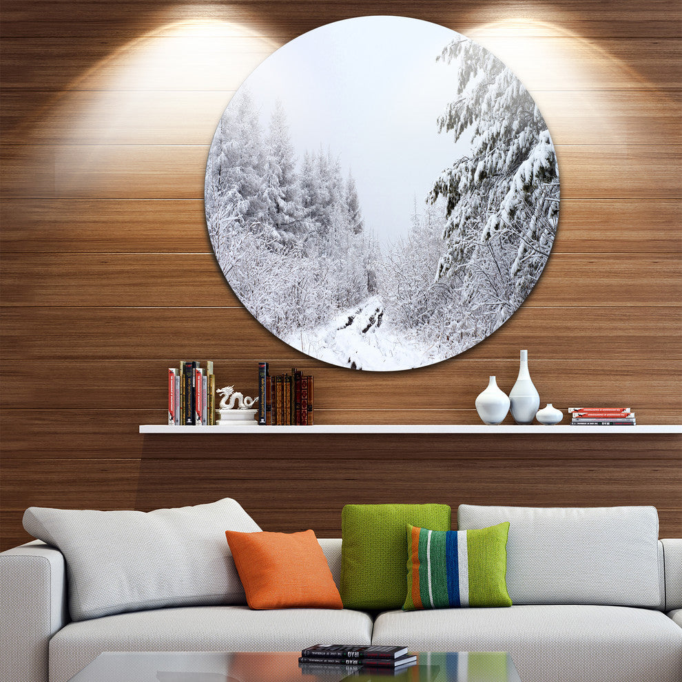 Frosted Forest Trail In Fall, Landscape Photo Disc Metal Artwork, 11"