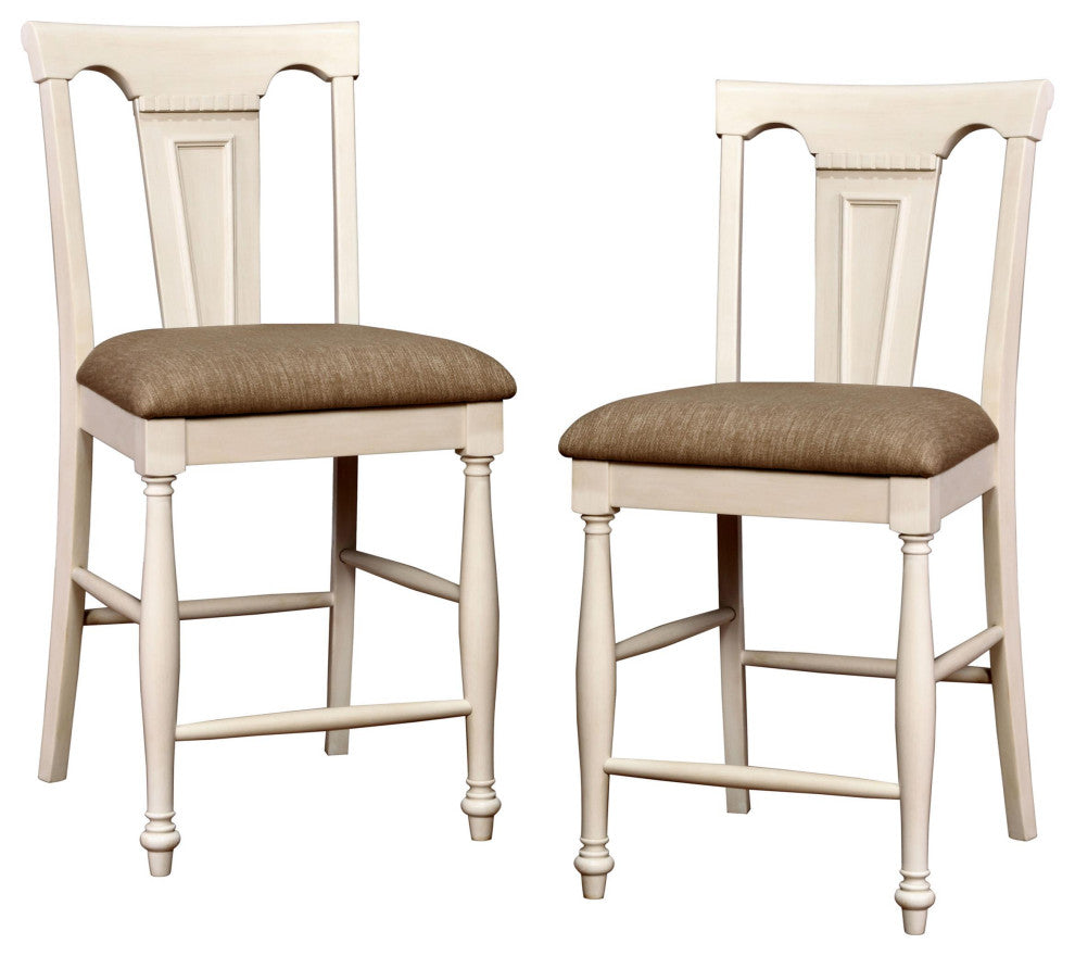 When you enjoy beautiful detailing and comfort, consider this set of two wood counter stools for your kitchen or dining area. These dining room chairs make a statement without being over the top. You"™ll love the linen-like fabric and padded seating that is both comfortable and attractive. Made from solid wood in a cottage style design, the white finish complements many color palettes.Features: • Includes: Two (2) Counter Height Chairs • Style: Transitional • Finish: Cherry, White • Materials: Solid Wood, Wood Veneer, MDF, Polyester • Padded cushions • Turned legs • Footrests • Easy to follow step by step assembly guide includedSpecifications: • Product Dimensions: 20"W x 23.5"D x 41.5"H • Seat Dimensions: 18"D x 26"H • Weight Capacity: 250 lbs. • Product Weight: 44 lbs. • Assembly Required: Yes • Warranty Description: 1-Year Manufacture Limited Replacement Parts Warranty