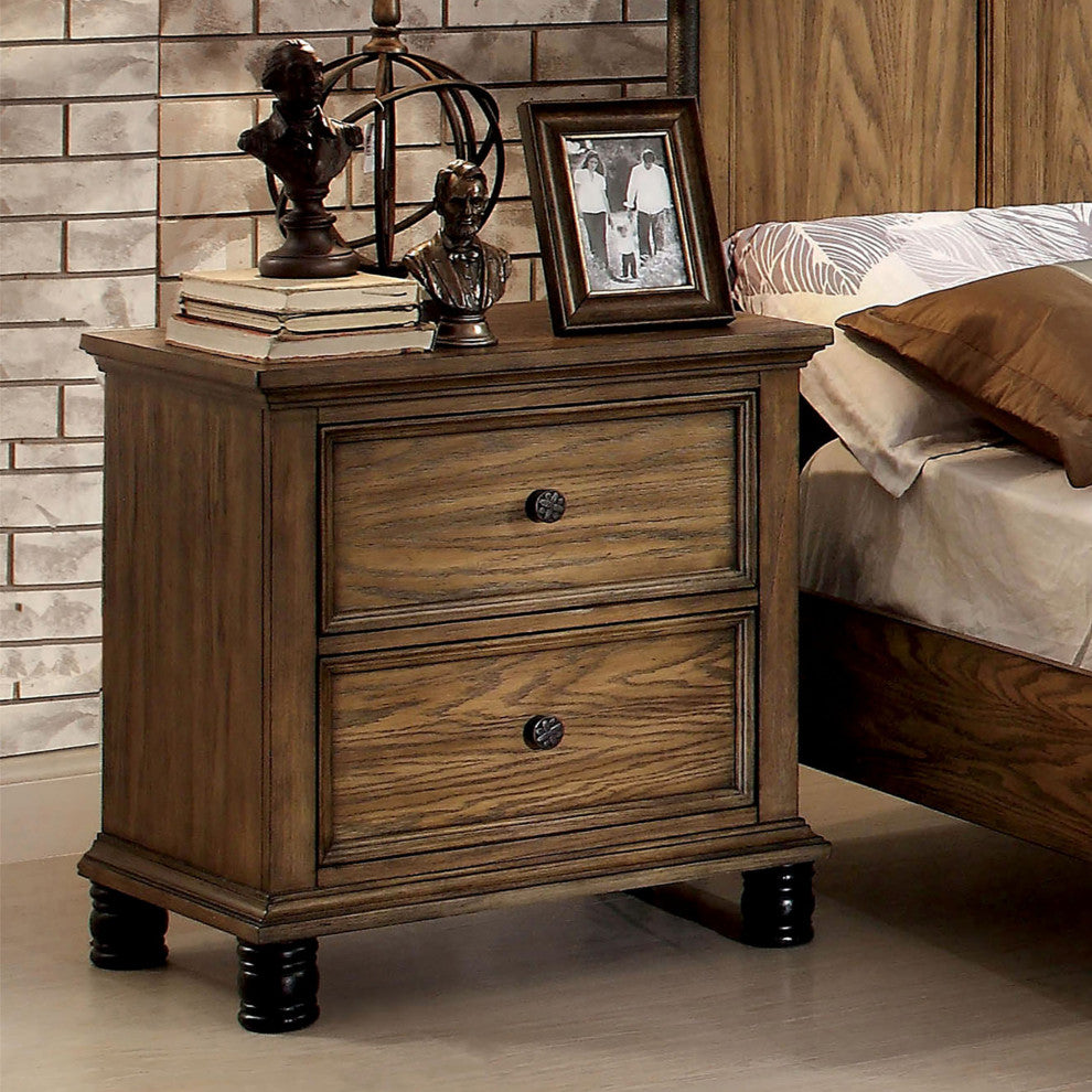 Modernize your sleeping space with this industrial style two-drawer nightstand in dark oak. Made from wood and metal, it features beautiful oak wood patterns, black metal legs, and black hardware with a floral design. This two-drawer nightstand will have you saying yes because of its modern style, storage space, and felt-line topped drawers. Conveniently holds your favorite books for bedtime reading along with an array of other items.Features: • Plenty of Storage - 2 drawers, providing you ample storage of your cell phone, books and other home items • Comes prepacked and delivered right to your front door pre-assembled • Includes: One (1) Nightstand • Style: Industrial • Finish: Dark Oak • Materials: Solid Wood, Wood Veneer, MDF • Round drawer pulls • Equipped with easy-pull metal glides • Carved wood feet • Wood-grain inspired panels • Spacious tabletop • Distressed finishSpecifications: • Product Dimensions: 26.75"W x 18"D x 26.75"H • Weight Capacity: 75 lbs. • Product Weight: 77 lbs. • Assembly Required: Yes • Warranty Description: 1-Year Manufacture Limited Replacement Parts Warranty