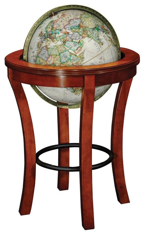 The Garrison highlights the bold character and classic design that fits perfect in any office, study or living room.This impressive 16-inch antique beige colored ocean globe with the latest National Geographic cartography in executive colors and solid hardwood stand contribute to the exceptional form and function of the Garrison.Additionally the globe features antique plated full, numbered die-cast meridian and a raised relief topographic globe ball.The Garrison is made in the USA by Replogle Globes.