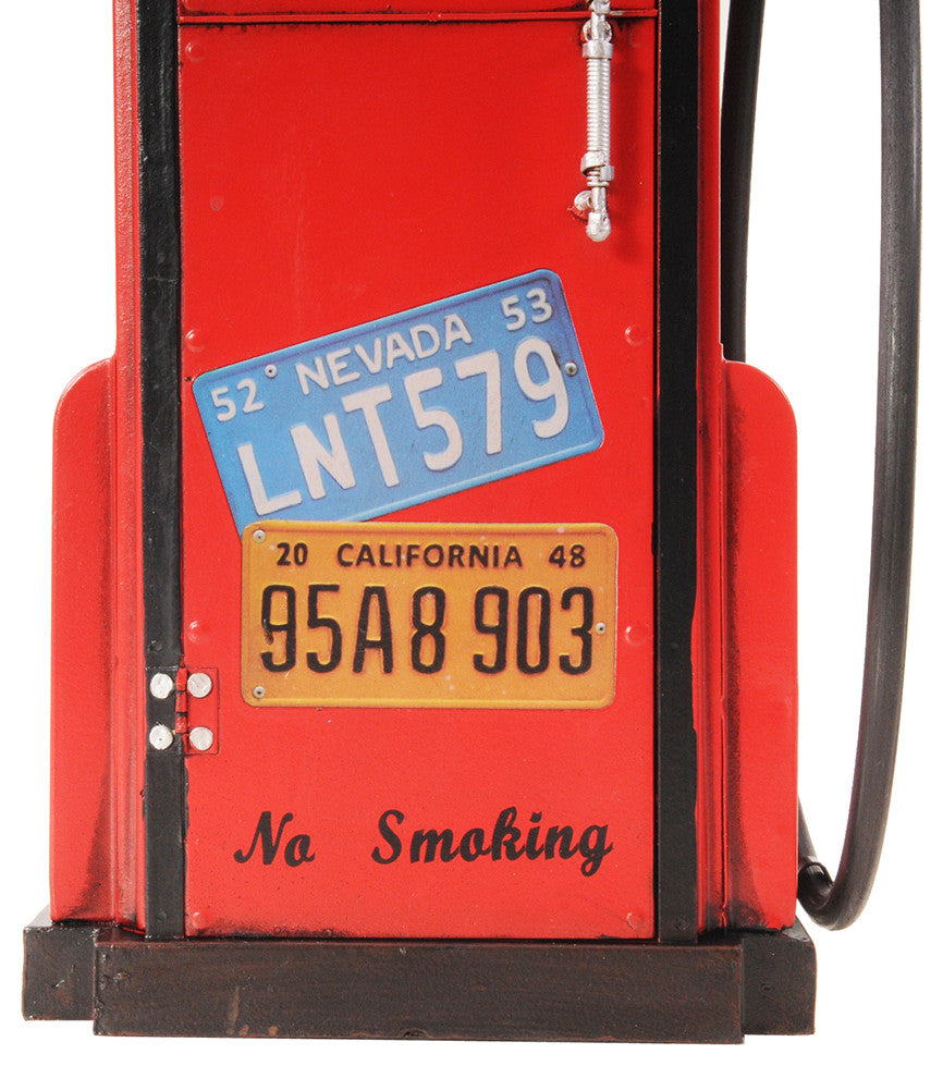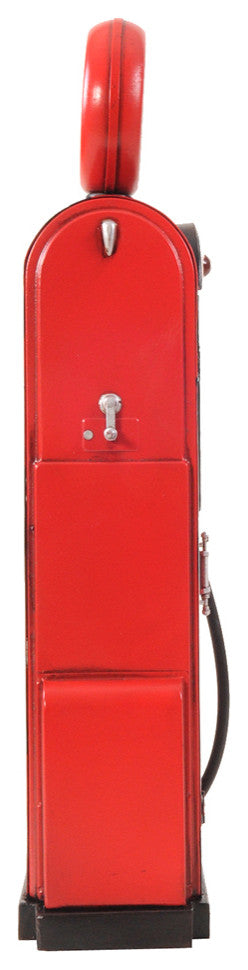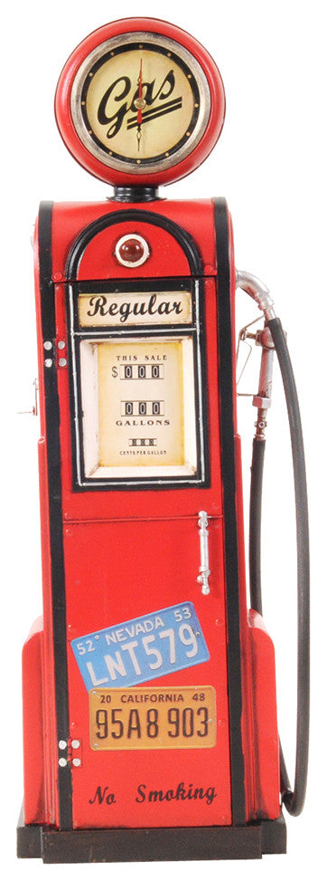 The first gas pumps were built in the 1880s by the Bowser Company in Fort Wayne, Indiana, followed in 1898 by pumps that could pull fuel from an underground tank. This beautiful antique replica gas pump has a working clock and is soldered, hand shaped, and hand painted in red. The decaled insignia and painted details give more of an authentic look. Intricate details are portrayed in the text, license plates, and metal wiring. It is made of iron and carefully handcrafted with an average of forty man-hours to complete. A stunning antique gas pump to display in your home or office! 100% iron frame Clock uses one AA battery (battery not included) Rubber gas hose