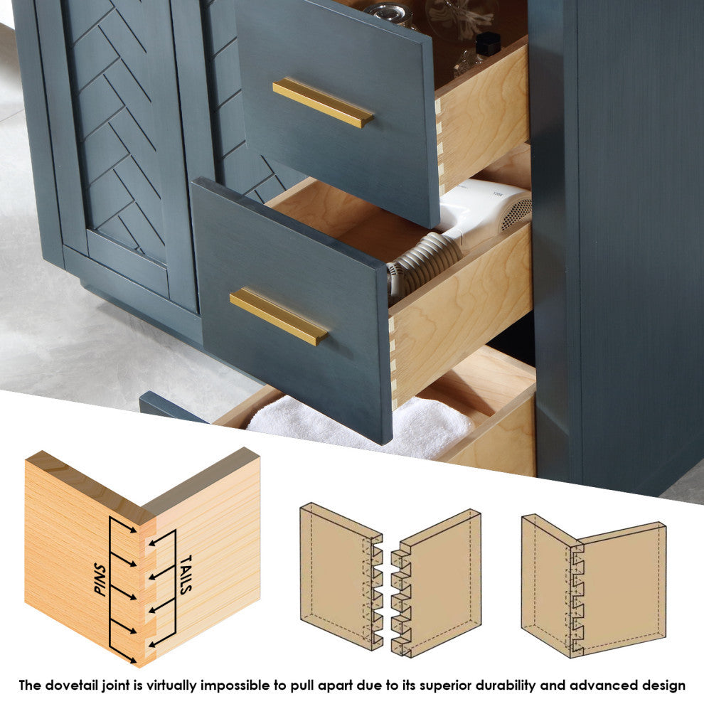 Perfect for the contemporary bathroom, our Gazsi Vanity offers the smart style you want with the everyday functionality you need. Architectural details include textured door panels with a chic chevron pattern as well as a recessed plinth base. Constructed of rugged wood materials, this vanity boasts ample and flexible storage space for all your bath essentials. The marbled composite stone countertop lends a touch of refinement while providing a striking contrast with the dark-colored modern cabinet.