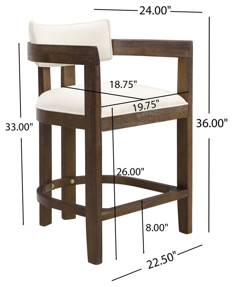 Sleek Contemporary Design: Elevate your dining or kitchen space with this set of two counter height bar stools. Their minimalistic yet refined structure showcases a contemporary aesthetic that seamlessly blends with any decor style.• Ergonomic Curved Backrest: Each stool features a beautifully crafted solid wood backrest with a graceful curved shape, providing excellent support and enhancing your comfort during meals or gatherings.• Luxurious Upholstery: Upholstered in high-quality fabric, these stools offer a smooth, immaculate texture and a refined appearance. The plush seating ensures cozy comfort, making them perfect for extended use.• Durable Rubberwood Frame: Made from environmentally-friendly rubberwood, these counter stools are built to last. The natural-grain finish not only adds visual appeal but also ensures durability for everyday use.• Stable and Reliable Support: Designed with sturdy wooden legs and a solid frame structure, these bar stools provide excellent stability and can support up to 330 lbs. With dimensions of 22.5" W x 24.00" D x 36.00" H, these stools are perfect for both safety and comfort. Assembly is required, but it''s simple and quick!• Include: Two (2) Bar StoolsMaterial: Fabric + Solid WoodColor: Multiple OptionsAssembly RequiredDimensions: 24.00 inches deep x 22.50 inches wide x 36.00 inches highSeat Height: 26.00 inches