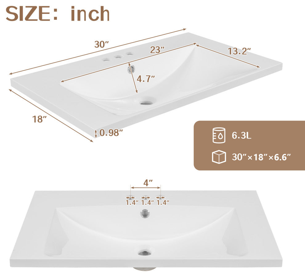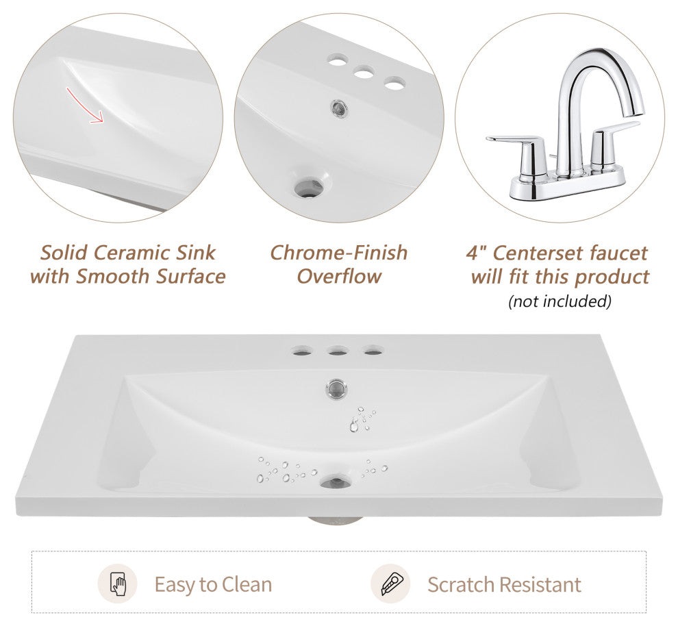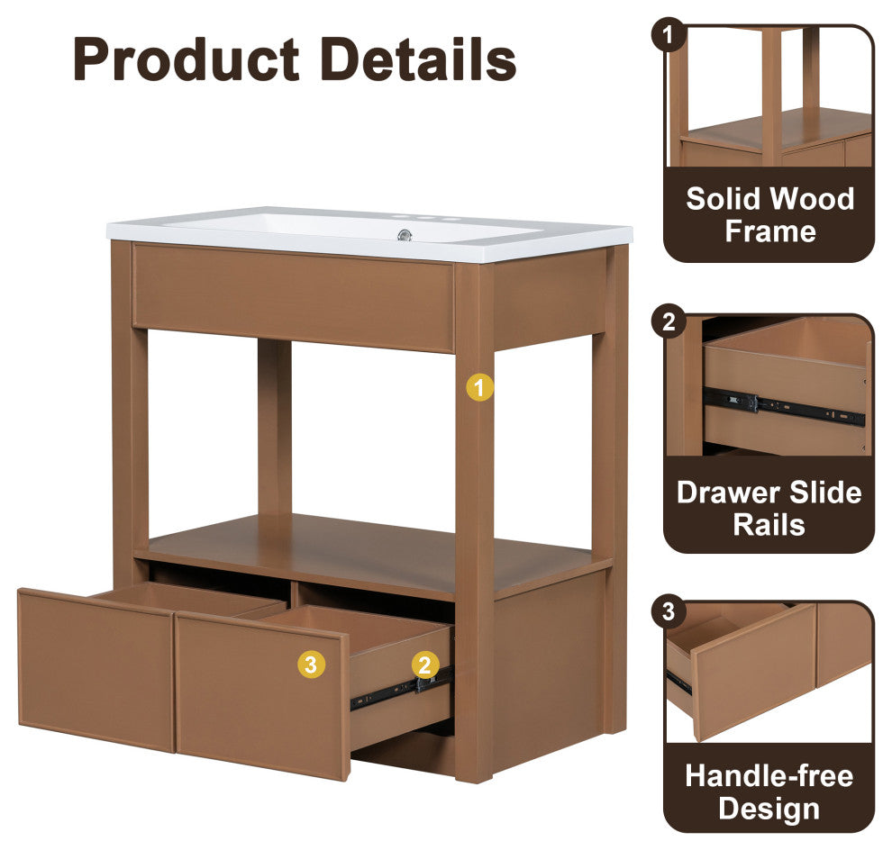 Elegant Ceramic Sink: The vanity features a solid ceramic sink in a sleek white finish, equipped with an overflow and three pre-drilled faucet holes. Designed for ease of cleaning, this sink allows you to maintain its shine effortlessly. An 4" faucet (not included) will fit perfectly, adding to the vanity''s functionality.• Stylish Design and Practical Details: This vanity showcases a natural body with a random wood grain pattern, blending beauty with practicality. The open construction in the middle enhances airflow and accessibility, while the open back design simplifies plumbing installation, making it a stylish yet functional addition to your bathroom.• Ample Storage Space: Designed for optimal organization, this bathroom vanity features an open shelf and two drawers equipped with smooth slide rails. Store your soaps, towels, shampoos, and other essentials conveniently, keeping them organized and dust-free, while maximizing your bathroom''s functionality.• Durable Material Construction: Crafted from solid wood and MDF boards, this 30" bathroom vanity ensures exceptional stability and longevity. The painted finish not only enhances its aesthetic appeal but also provides a waterproof and stain-resistant surface, making it easy to clean and maintain for years of use.• Convenient One Package Assembly: This bathroom vanity comes in one package for easy transport and assembly. All necessary hardware and an instruction manual are included, making the installation process straightforward. Enjoy the satisfaction of setting up your new vanity and enhancing your bathroom decor effortlessly.• Includes: One (1) Bathroom VanityMaterial: Solid Rubber Wood + MDF Board + CeramicColor: Multiple OptionsAssembly RequiredDimensions: 30.00 inches wide x 18.00 inches deep x 34.00 inches high