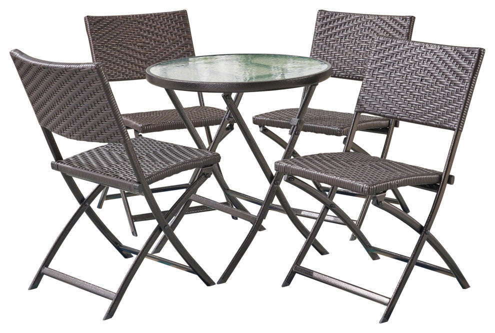 Enjoy your morning coffee on your deck or out by the pool with this Jason five-piece folding furniture set. This outdoor folding set includes one table and four chairs. The chair''s polyethylene wicker construction is weather-resistant and UV-protected to provide year-round comfort. When not in use, this folding furniture set can be easily folded up and put into storage. Features:One (1) table, four (4) chairsMade of polyethylene wicker and powder coated ironMulti-brown in color, compliments most existing outdoor decorWeather-resistant + UV ProtectionNo assembly requiredDimensions:Table dimensions: 28" L x 28" W x 28" HChair dimensions: 22.5" L x 18" W x 33.25" H Seat dimensions: 15" L x 16.25" W x 18" H