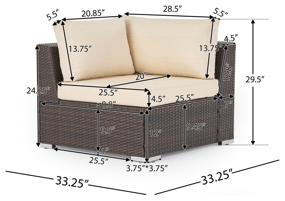 From backyard barbeques to enchanting summer evenings with your family, our five-seater sectional sofa chat set has you covered in both style and comfort. With an aluminum frame, a wicker finish, and a coffee table with a tempered glass top, this set adds a perfect balance of elegance and durability. Choose between Sunbrella or water-resistant cushions for long-lasting comfort that is sure to impress. If you choose one of our Sunbrella options, the covers will be shipped separately and should arrive within 72 hours of your set.POLYETHYLENE RATTAN: Featuring a long-lasting woven finish, this style is not only incredibly durable but also provides a versatile appearance. The intricate details of this material allow this piece to blend seamlessly with your decor.ALUMINUM FRAME: This accessory is built with lightweight aluminum, creating a versatile yet durable frame. This material is rust-resistant which will further extend the life of your product.WATER-RESISTANT OR SUNBRELLA CUSHIONS: Our cushions are covered with a non-porous material that makes cleaning any spill a breeze. If you choose one of our Sunbrella options, the covers will be shipped separately and should arrive within 72 hours of your set. Please note that if you do not choose a Sunbrella set, the cushions are water-resistant and not waterproof. Please do not submerge in water.TEMPERED GLASS TOP: The coffee table for this set features a tempered glass top for a smooth, glossy look that offers a stable surface for your drinks and snacks. This glass is made to be stronger and safer than regular glass, making this more resistant to breakage and shattering.MODULAR: This sectional chat set contains separate pieces so you can arrange your furniture to your liking. The coffee table is 33.25" W x 30.50" D x 13.50" H and the five-piece sectional sofa offers a convenient modular arrangement. You will love how much your space can transform with the simple addition of this charming set.Includes: One (1) corner chair, two (2) armless chair, one (1) right armchair, one (1) left armchair and one (1) tableMaterial: Faux RattanFrame Material: AluminumTabletop Material: Tempered GlassMultiple Cushion Material OptionsMultiple Color OptionsAssembly RequiredOptional Sunbrella Cushion Covers should arrive within 72 Hours of your setAll Dimensions Exclude Cushion MeasurementsLeft and Right Arm Chair Dimensions: 33.25 inches deep x 33.50 inches wide x 24.25 inches highLeft and Right Seat Dimensions: 25.50 inches deep x 28.75 inches wide x 12.00 inches highWeight Capacity: 400 lbsArm Height: 24.25 inches highArmless Chair Dimensions: 33.25 inches deep x 25.50 inches wide x 24.25 inches highArmless Seat Dimensions: 25.50 inches deep x 25.50 inches wide x 12.00 inches highCorner Dimensions: 33.25 inches deep x 33.25 inches wide x 24.25 inches highCorner Seat Dimensions: 25.50 inches deep x 25.50 inches wide x 12.00 inches highSeat Cushion Thickness: 4.50 inchesTable Dimensions: 30.50 inches deep x 33.25 inches wide x 13.50 inches highWeight Capacity: 300 lbs