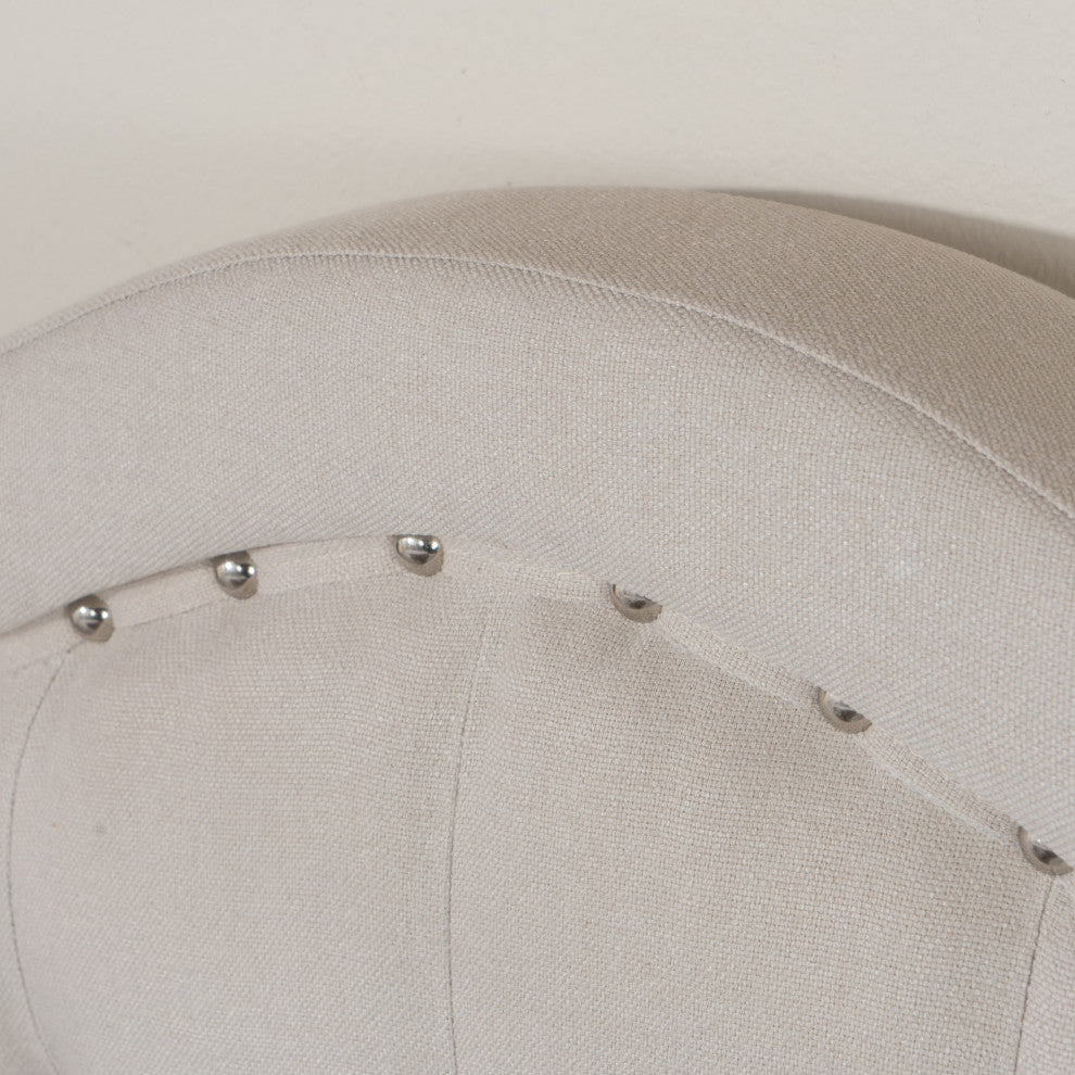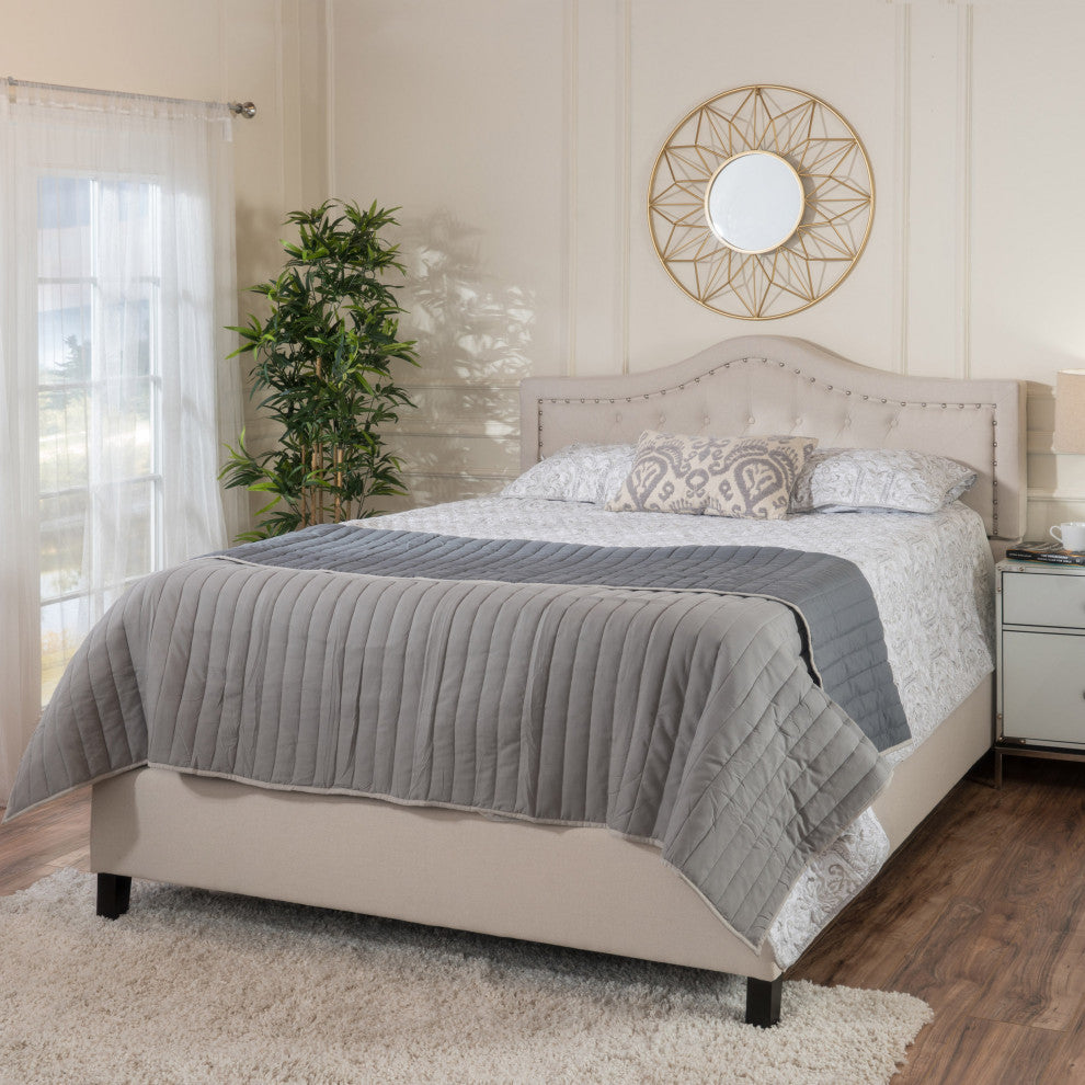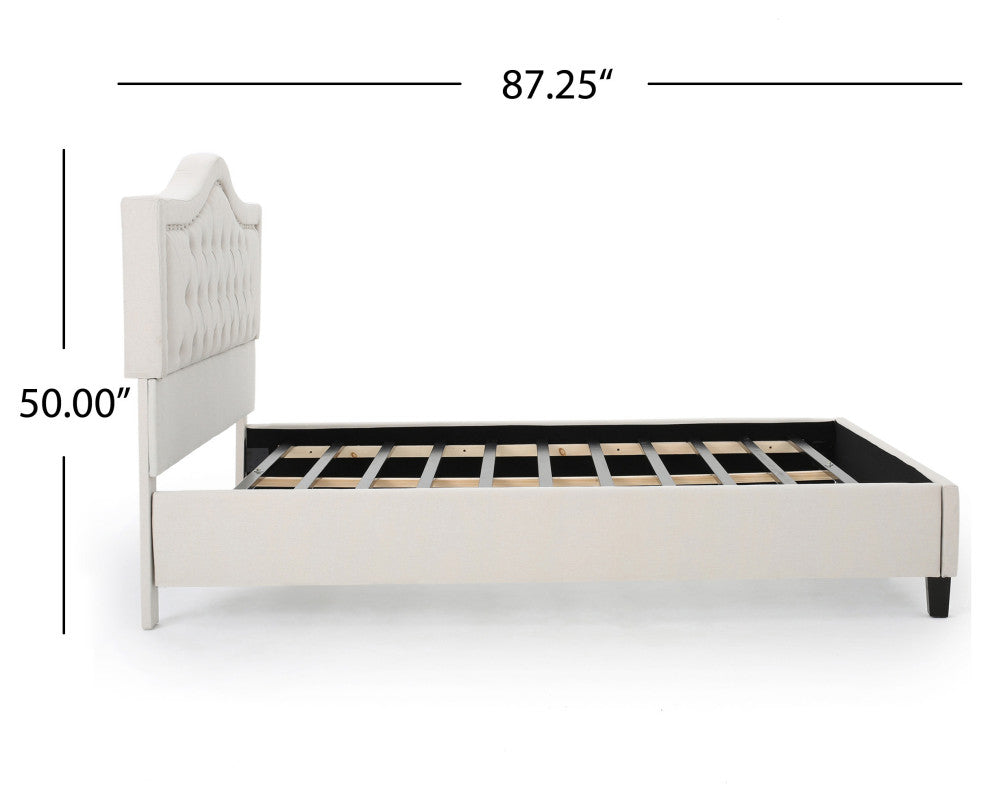 Transform your bedroom space with absolute elegance that is sure to brighten your interior decor. Our stylish bed set offers a timeless elegance for your home while providing a sophisticated appeal and low profile build to eliminate the use of a box spring. Featuring a beautiful camelback silhouette, wonderful upholstery, lovely button-tufted diamond stitching, and a stunning nailhead trim, this refined bed frame is made for ultimate comfort and unparalleled style, imbuing any room with a feeling of contemporary style. CONTEMPORARY DESIGN: Featuring smooth upholstery, a camelback silhouette, button-tufted diamond stitching, and a nailhead trim, our bed set offers the look, feel, and design of a truly contemporary piece. With a minimalistic yet refined structure, this set brings out a simplistic style that emphasizes comfort and functionality. BUTTON TUFTED DIAMOND STITCH: The button-tufted stitching in the headboard offers an extra touch of sophistication that enhances its contemporary design. The diamond stitch pattern adds a bit of texture without sacrificing any comfort.NAILHEAD ACCENTS: This bed set spares no expense when it comes to its finishing details. Expertly styled, this piece has tasteful nailhead accents bordering the headboard. Each nailhead is individually applied for a beautiful, hand-crafted touch.LOW PROFILE: This bed set features a platform frame that eliminates the need for a box spring. This allows for your mattress to be placed directly on the frame without the extra hassle.DIMENSIONS: Choose an accessory that is the perfect size for you and your furniture. This bed set is 66.00"� W x 87.30"� D x 50.50"� H. You will love how much your space can transform with the simple addition of this bed set.Includes: One (1) Frame and One (1) HeadboardMaterial: FabricFabric Composition: 100% PolyesterFrame Material: Birch WoodColor: Ivory/Dark GrayLeg Finish: Dark BrownHand-Crafted DetailsAssembly RequiredDimensions: 87.30 inches deep x 66.00 inches wide x 50.50 inches high