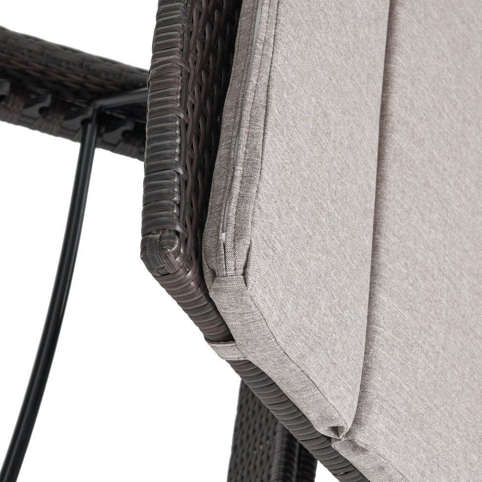 Add some stylish comfort to your patio decor with this wicker lounge now with arm rests. Both the chair and cushion are weather resistant and with an adjustable back and folding legs for easy stacking. Available with select cushion colors.Features:Includes: One (1) Lounge Chair and One (1) Lounge Chair CushionMaterials: Iron and PECushion Material: PolyesterColor: Multi BrownCushion Colors available in: Blue, Mocha, Charcoal, or Navy BlueSome Assembly RequiredDimensions: 79.50"D x 27.50"W x 13.80"HCushion Dimensions: 80.31"D x 27.55"W x 1.98"H