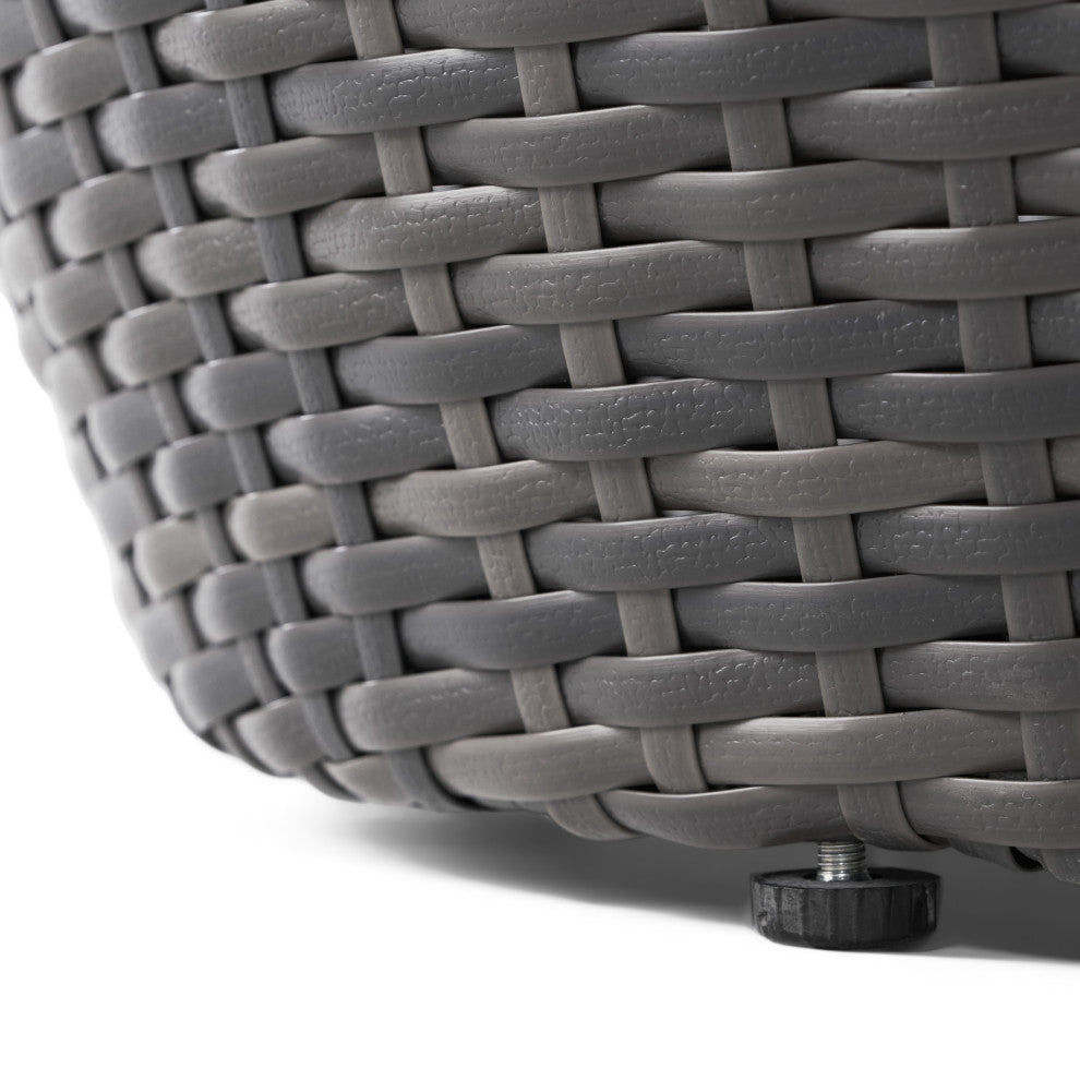 Make sure you always have somewhere to set down your drink or reading material. This fetching side table will make an ideal accompaniment to your patio or yard furniture. Made from high-quality wicker over a durable iron frame, this piece is sure to attract compliments from visitors.Product DetailsIncludes: One (1) Side TableMaterial: Polyethylene WickerFrame Material: IronWicker Finish: GrayNo Assembly RequiredDimensions: 19.25"D x 19.25"W x 20.00"H
