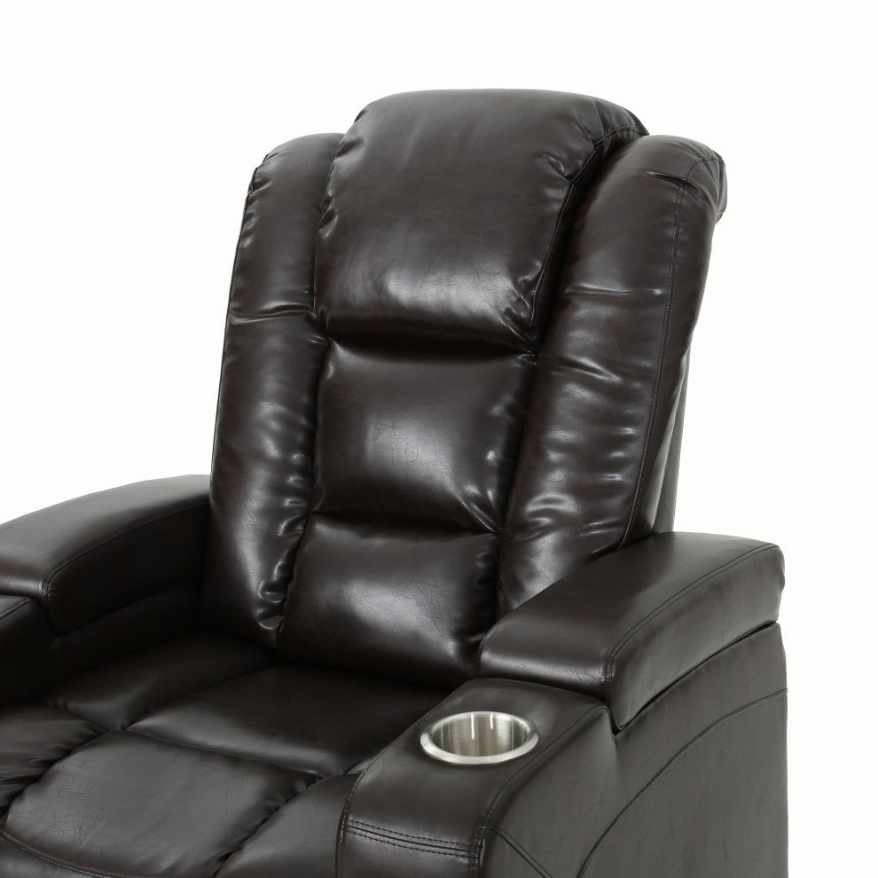 Our delightful motor-powered recliner chair provides an incredibly high degree of refreshment in a compact and attractive package, emphasizing a sophisticated and charming contemporary design. Featuring a plush tufted backrest, armrests with storage, an included USB port, and two cup holders, this recliner pairs perfectly with its convenient functionality allowing for high comfort with little effort. Sure to become the new favorite spot of leisure, you and your family will surely enjoy this recliner whenever you have a moment to unwind.CONTEMPORARY DESIGN: Featuring a plush tufted design, our recliner offers the look, feel, and design of a truly contemporary piece. With a minimalistic yet refined structure, this chair brings out a simplistic style that emphasizes comfort and functionality.MULTI-FUNCTIONAL: This recliner includes two cup holders, a convenient USB port, and armrests with storage, making this the pinnacle of convenient functionality.UPHOLSTERED: Our recliner is generously upholstered, giving any room a refined appearance. This provides a smooth, immaculate texture for this piece, as well as plush seating for comfort.DIMENSIONS: Choose an accessory that is the perfect size for you and your furniture. This recliner is 33.00" W x 40.00" D x 41.75" H in its upright position and 32.75" W x 66.25" D x 32.00" H when fully reclined. You will love how much your space can transform with the simple addition of this charming recliner.ASSEMBLY REQUIRED: Some assembly is required for this recliner. All of the instructions and tools needed for assembly are included.Includes: One (1) ReclinerMaterial: Polyurethane LeatherLeg Material: PlasticColor: BrownLeg Finish: BlackAssembly RequiredPower Outlet RequiredDimensions: 40.00 inches deep x 33.00 inches wide x 41.75 inches highReclined Dimensions: 66.25 inches deep x 32.75 inches wide x 32.00 inches highSeat Dimensions: 22.00 inches deep x 20.50 inches wide x 19.25 inches highArm Height: 25.00 inchesWeight Capacity: 300 lbs