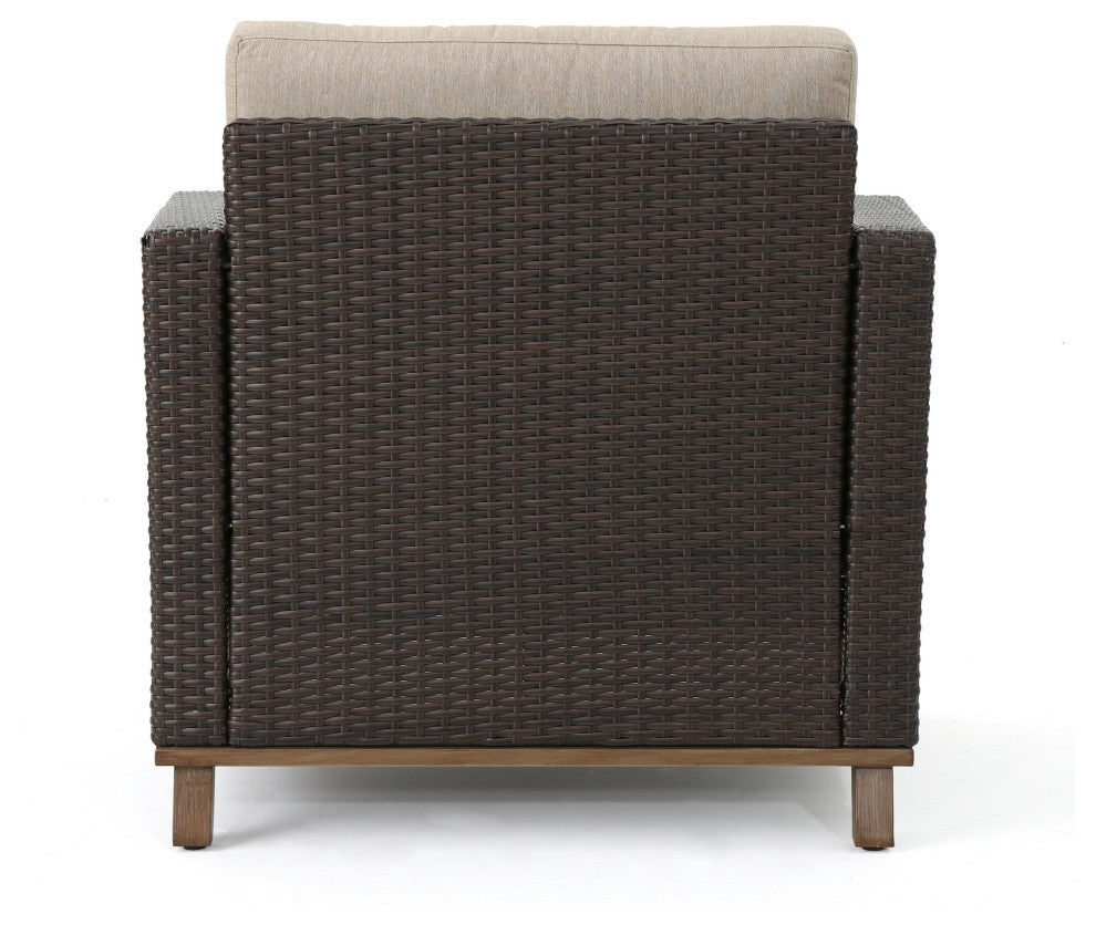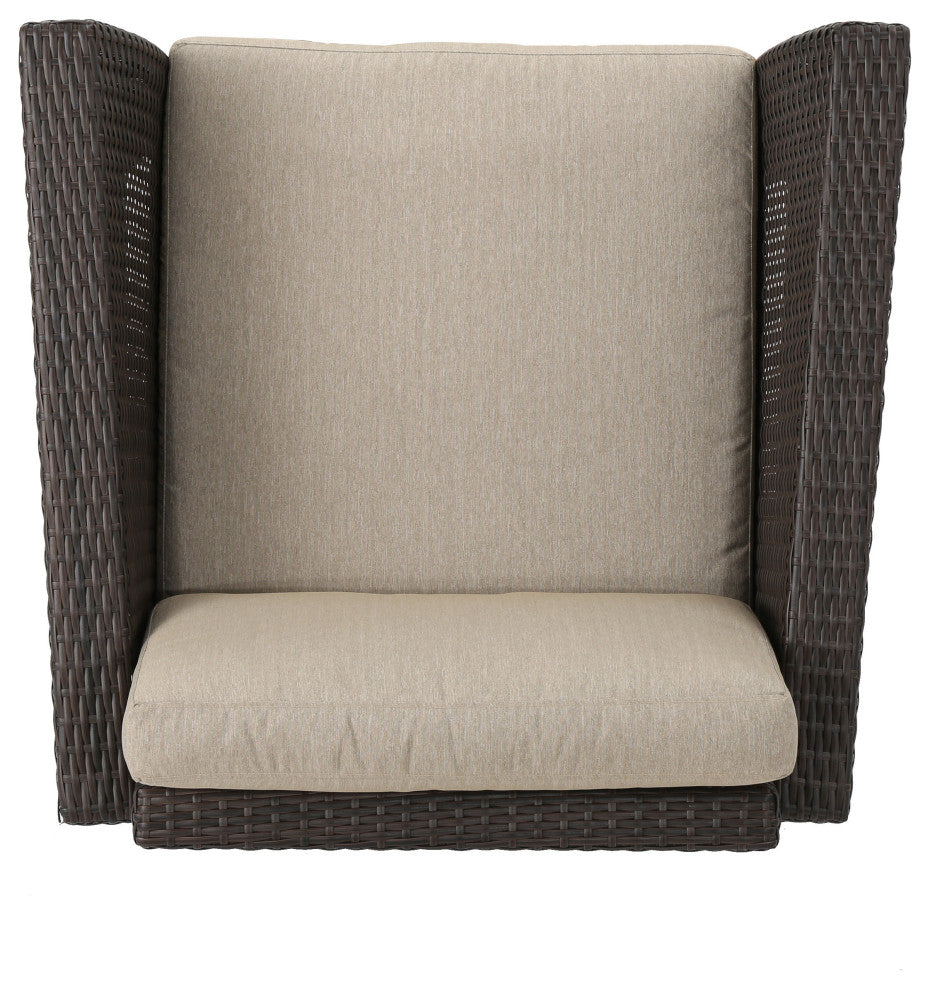 These club chairs will offer luxurious and attractive outdoor seating to friends and family looking for a place to relax. Use them on patios or porches, in the backyard or poolside. Crafted according to the highest standards, these are sure to give you years and years of enjoyment.Product Details:Includes: Two (2) Club ChairsMaterial: Polyethylene WickerFrame Material: AluminumCushion Material: Water Resistant FabricComposition: 100% PolyesterWicker Finish: Mixed BrownCushion Color: Mixed BeigeLeg Finish: Coffee BrownAssembly RequiredDimensions: 33.50" D x 34.25" W x 28.50" HSeat Width: 23.75"Seat Depth: 25.50"Seat Height: 16.00"