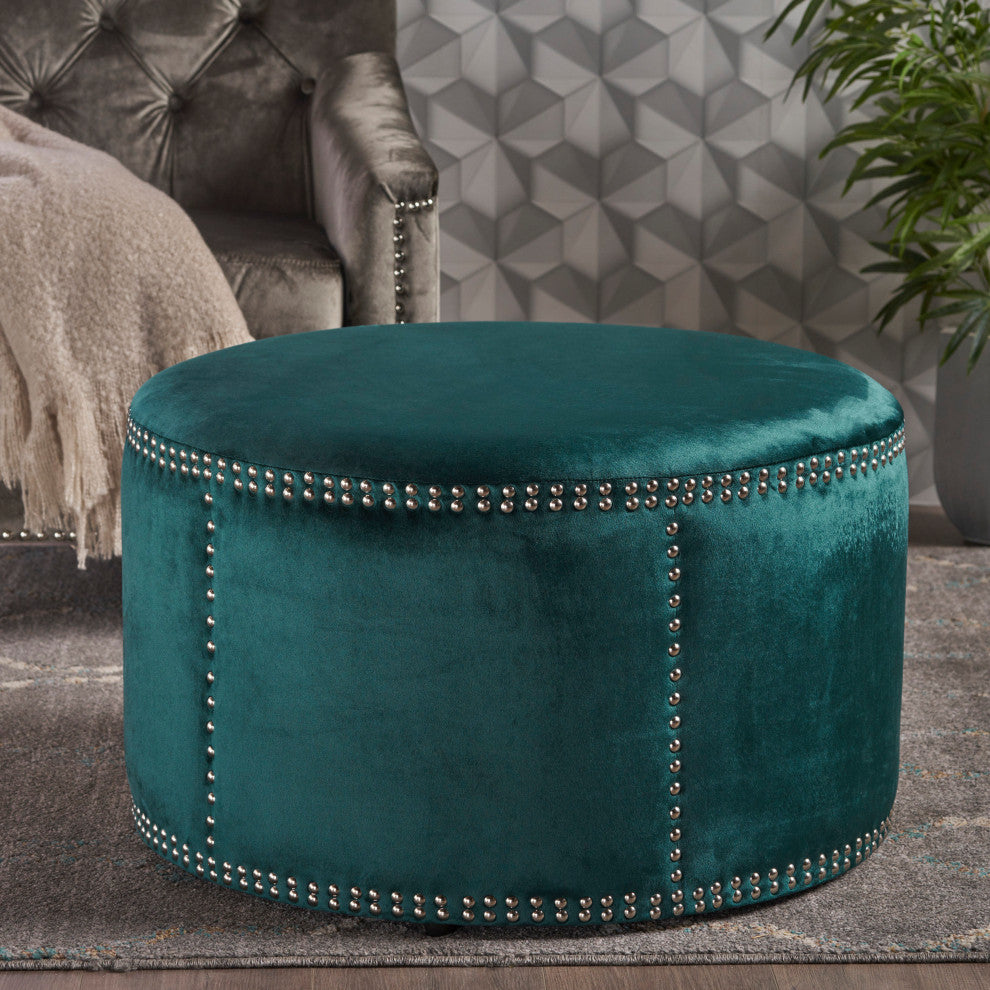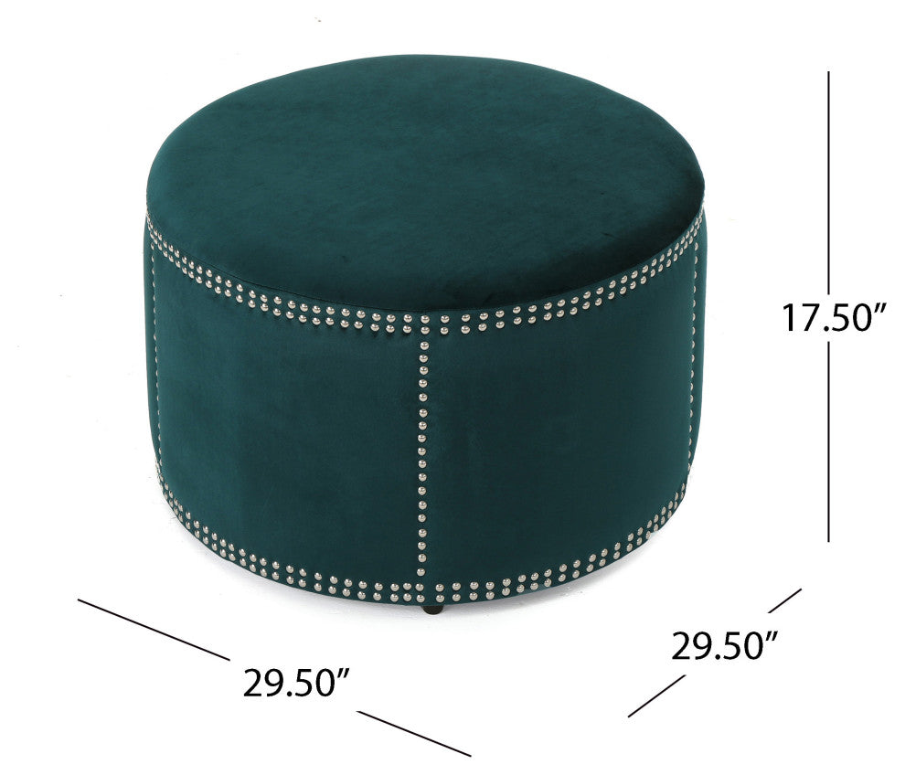 This studded ottoman means that you''ll always have a fashionable place to rest your feet. Its round body makes it the perfect focal point for any decor in any room. Crafted according to the highest standards from quality materials, this is a purchase you won''t regret.Product Details:Includes: One (1) OttomanMaterial: New VelvetComposition: 100% PolyesterLeg Material: PlasticColor available in: Teal, Gray, Plum, of ChampagneLeg Finish: BlackNo Assembly RequiredDimensions: 29.50" D x 29.50" W x 17.50" H