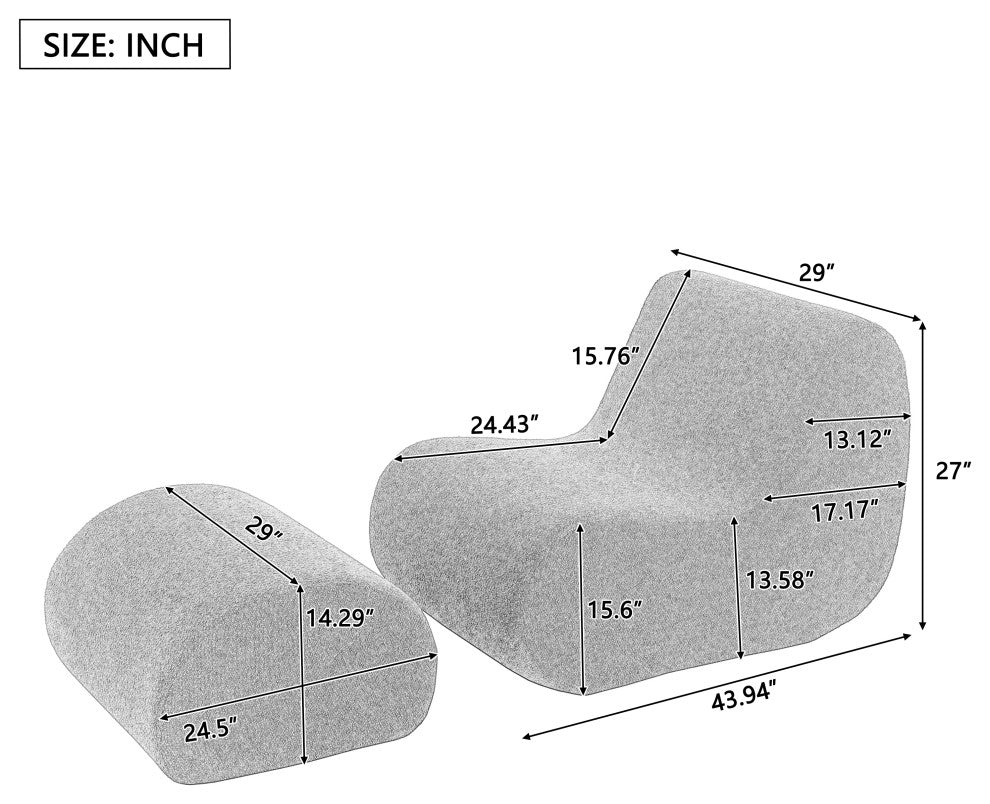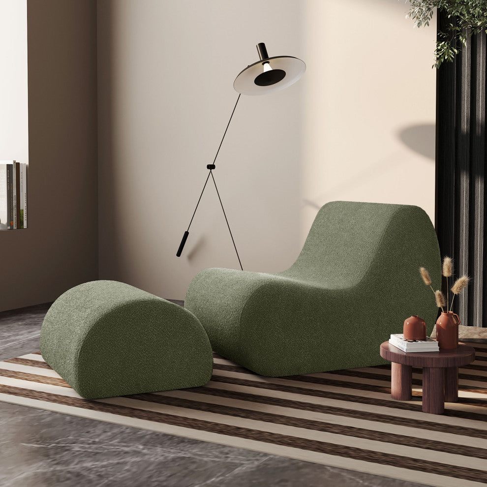 Make a bold statement with this modern upholstered curved accent chair and matching ottoman. Designed for both comfort and style, its sleek, sculptural silhouette and vibrant fabric add a contemporary touch to any space. The curved backrest provides ergonomic support, while the cushioned ottoman enhances relaxation. Perfect for living rooms, bedrooms, or stylish lounge areas.• • VERSATILITY: Elegant design complements various decor styles, perfect for living rooms, studies, or bedrooms• • LUXURY: High-resilience foam provides plush, comfortable seating for a luxurious lounging experience• • DURABILITY: Built with quality materials for lasting support and stability, ensuring long-term use• • EASY MAINTENANCE: Minimalist design and durable upholstery make cleaning and upkeep effortless• • Includes: One (1) Accent Chair and Ottoman Set• Ergonomic curved design supports natural posture for optimal relaxation• Minimalist lines paired with an ottoman for enhanced comfort and style• Hassle-free setup with no assembly required-eady to use out of the box• High-resilience foam provides plush seating and lasting support• Versatile and stylish design complements any room decor• DIMENSIONS CHAIR: 43.94" W x 29" D x 27" H• DIMENSIONS OTTOMAN: 29" W x 24.5" D x 14.29" H• Weight Capacity: 250 lb