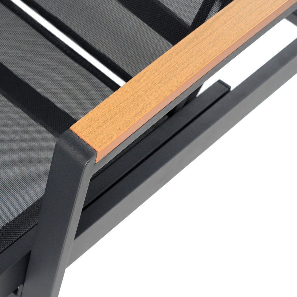 For a stylish and comfortable addition to your backyard or patio space, these outdoor chaise lounges are ideal for those warm sunny days filled with relaxation. Featuring breathable mesh seats and sturdy aluminum frames, these chaise lounges offer ultimate comfort and stability. With five adjustable reclining positions, this sleek outdoor accessory allows you to treat yourself to a world of luxurious contentment. Whether you are curling up with your favorite book or taking in the fresh air, our chaise lounge set is sure to give you your lazy weekend days back. ALUMINUM FRAME: This chaise lounge set is built with aluminum, creating a lightweight and stable frame. This material is rust-resistant which will further extend the life of your product. MESH SEATING: This features seating constructed of outdoor mesh material, making our chaise lounges both flexible and supportive. This lightweight material allows air to circulate and ventilates body heat on a hot day. ADJUSTABLE: Our chaise lounge set offers adjustable seating to ensure maximum comfort. This chaise accommodates five different positions, including a fully reclined option. DIMENSIONS: Choose an accessory that is the perfect size for you and your furniture. Each chaise lounge is 77.25" W x 28.75" D x 21.00" H and can open up to 77.25" W x 28.75" D x 39.50" H. You will love how much your space can transform with the simple addition of this charming lounge set.ASSEMBLY REQUIRED: Some assembly is required for this chaise lounge. All of the instructions and tools needed for assembly are included. This comes as a set of two.Includes: Two (2) Chaise LoungesMaterial: Outdoor MeshFrame Material: AluminumFinish: BlackHand-Crafted DetailsAssembly RequiredDimensions: 77.25 inches deep x 28.75 inches wide x 21.00-39.50 inches highArm Height: 20.90 inches