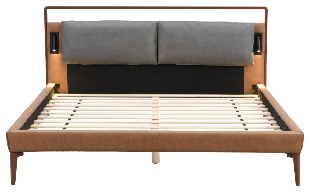 • [Modern & Functional Design] The sleek brown and gray leather upholstery with LED lighting enhances the contemporary aesthetic, making it a stylish addition to any bedroom.