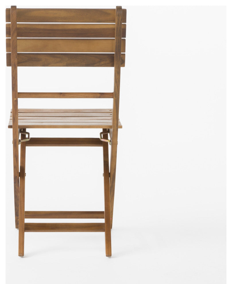 Folding tables and chairs don''t always have to look drab and plastic during outdoor parties and casual dinners. With our charming acacia wood dining set, you can effortlessly enjoy eating in style in the great outdoors with your family. This set also features a convenient folding function, offering the added benefit of easy storage when it is not in use. Perfect for when you have guests over, this set is there when you need some quick and easy extra seats or serving spaces. Unfold, use, fold, store, repeat.ACACIA WOOD: Made with acacia wood that brings a sleek and exotic look to your space, this durable hardwood naturally withstands outdoor elements and will not darken over time. Acacia wood is perfect as a solid, heavy frame that resists wear and tear.FOLDABLE: Designed to be compact, this dining set can fold for easy storage or transport. Simply unlock the wooden locks on the table and chairs and fold the frames flush against the tabletop and backrest. SLAT PANEL DESIGN: The chairs and table both feature beautifully slat paneling in the seating, backrests, and tabletop, giving this set a sophisticated, classic look. This motif provides a wonderfully homey feel to your decor.DIMENSIONS: Choose an accessory that is the perfect size for you and your furniture. Each chair is 15.75" W x 20.50" D x 33.75" H and the table is 42.50" W x 27.50" D x 29.75" H. You will love how much your space can transform with the simple addition of this charming ottoman.ASSEMBLY REQUIRED: Some assembly is required for this outdoor dining set. All of the instructions and tools needed for assembly are included.Includes: One (1) Folding Table and Four (4) Folding ChairsMaterial: Acacia WoodMultiple Color OptionsHand-Crafted DetailsAssembly RequiredTable Dimensions: 27.50 inches deep x 43.50 inches wide x 29.75 inches highChair Dimensions: 20.50 inches deep x 15.75 inches wide x 33.75 inches highSeat Dimensions: 12.25 inches deep x 15.75 inches wide x 17.75 inches high