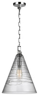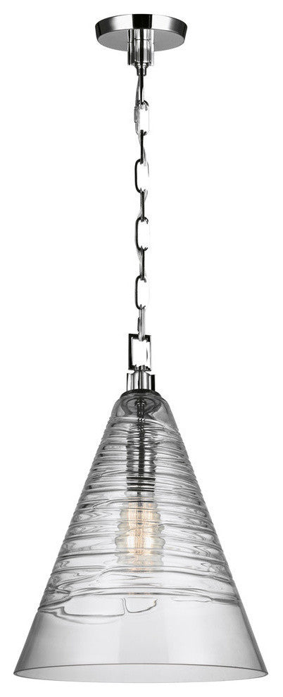 The Generation Lighting Elmore one light indoor pendant in chrome provides abundant light to your home, while adding style and interest. The Elmore pendant collection from Generation Lighting features Clear Candy glass achieved through a multi-step, artisanal process of wrapping small rods of glass around the glass shade to create a textured, vibrant surface that subtly conceals the light source and refracts the light to create a wonderful sparkle. These spectacular, large scale glass shades are available in two classic profiles, a cone or cylinder (both shapes are 18 high), which would easily accent an urban, eclectic loft as well as more traditional, settings looking for rich textures to complement the surrounding decor. Beautiful cast details, like the tailored square link chain in a Chrome or Burnished Brass finish, complete this timeless look, which is versatile enough to work well as entry lighting, dining room lighting, living room lighting, bedroom lighting or kitchen lighting.