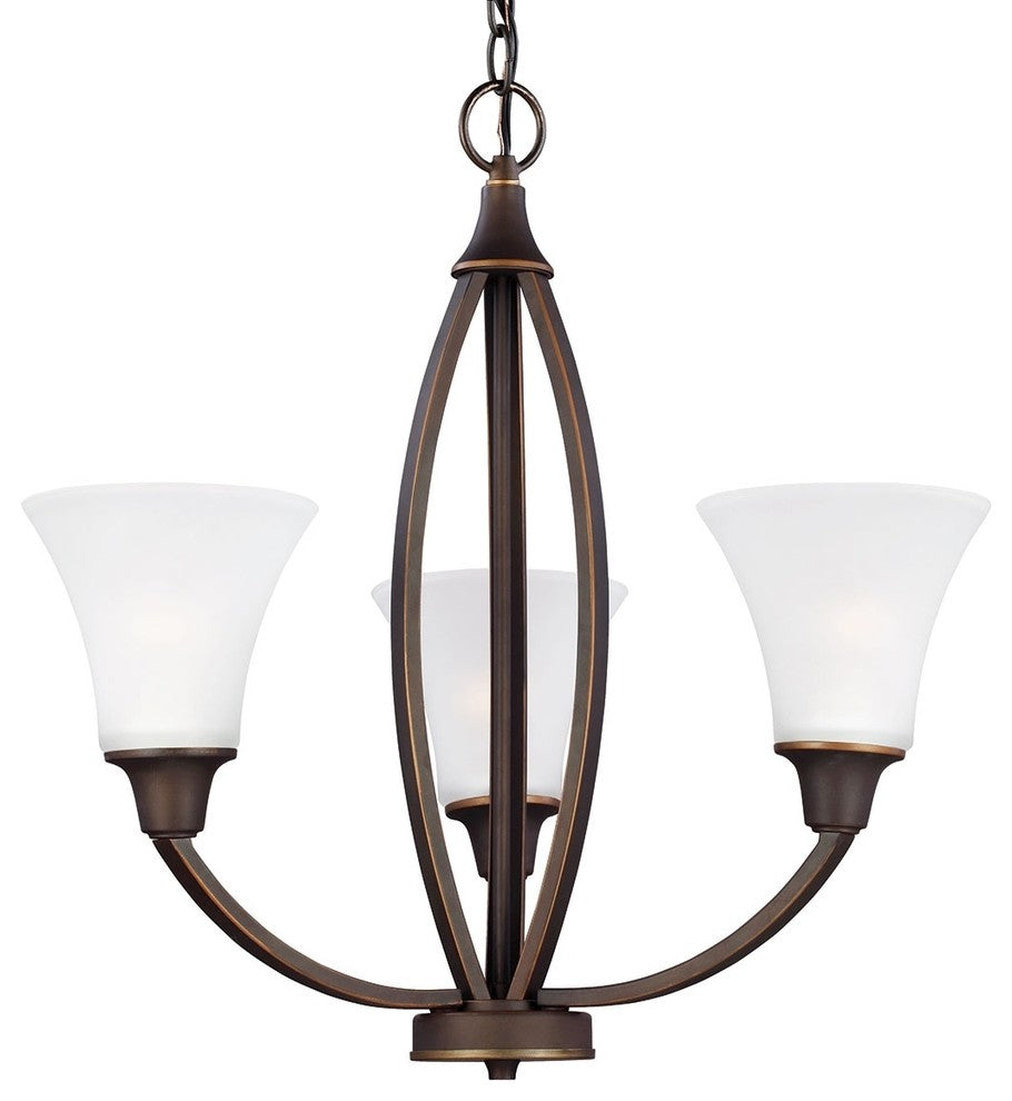 The Generation Lighting Lighting Metcalf three light single tier chandelier in autumn bronze is the perfect way to achieve your desired fashion or functional needs in your home. The soft curves give the transitional Metcalf lighting collection by Generation Lighting Lighting its clean, subtle look. The modern silhouette of the Satin Etched glass shades reinforces the easy and casual lines of this design. Equally at home in a contemporary, urban setting or a transitional decor in the suburbs, the full lighting collection is offered in Autumn Bronze and Brushed Nickel finishes and is comprised of nine-light, five-light and three-light chandeliers; a two-light semi-flush mount; and one-light, two-light, three-light and four-light bath fixtures. Incandescent, LED and Energy star-qualified fluorescent lamping are available