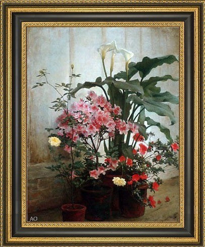 18" x 24" George Cochran Lambdin Side of a Greenhouse framed premium canvas print reproduced to meet museum quality standards. Our Museum quality canvas prints are produced using high-precision print technology for a more accurate reproduction printed on high quality canvas with fade-resistant, archival inks. Our progressive business model allows us to offer works of art to you at the best wholesale pricing, significantly less than art gallery prices, affordable to all. This artwork is hand stretched onto wooden stretcher bars, then mounted into our 3 3/4" wide gold finish frame with black panel by one of our expert framers. Our framed canvas print comes with hardware, ready to hang on your wall. We present a comprehensive collection of exceptional canvas art reproductions by George Cochran Lambdin.