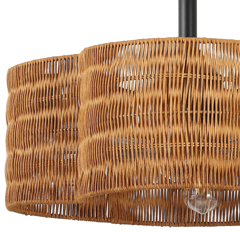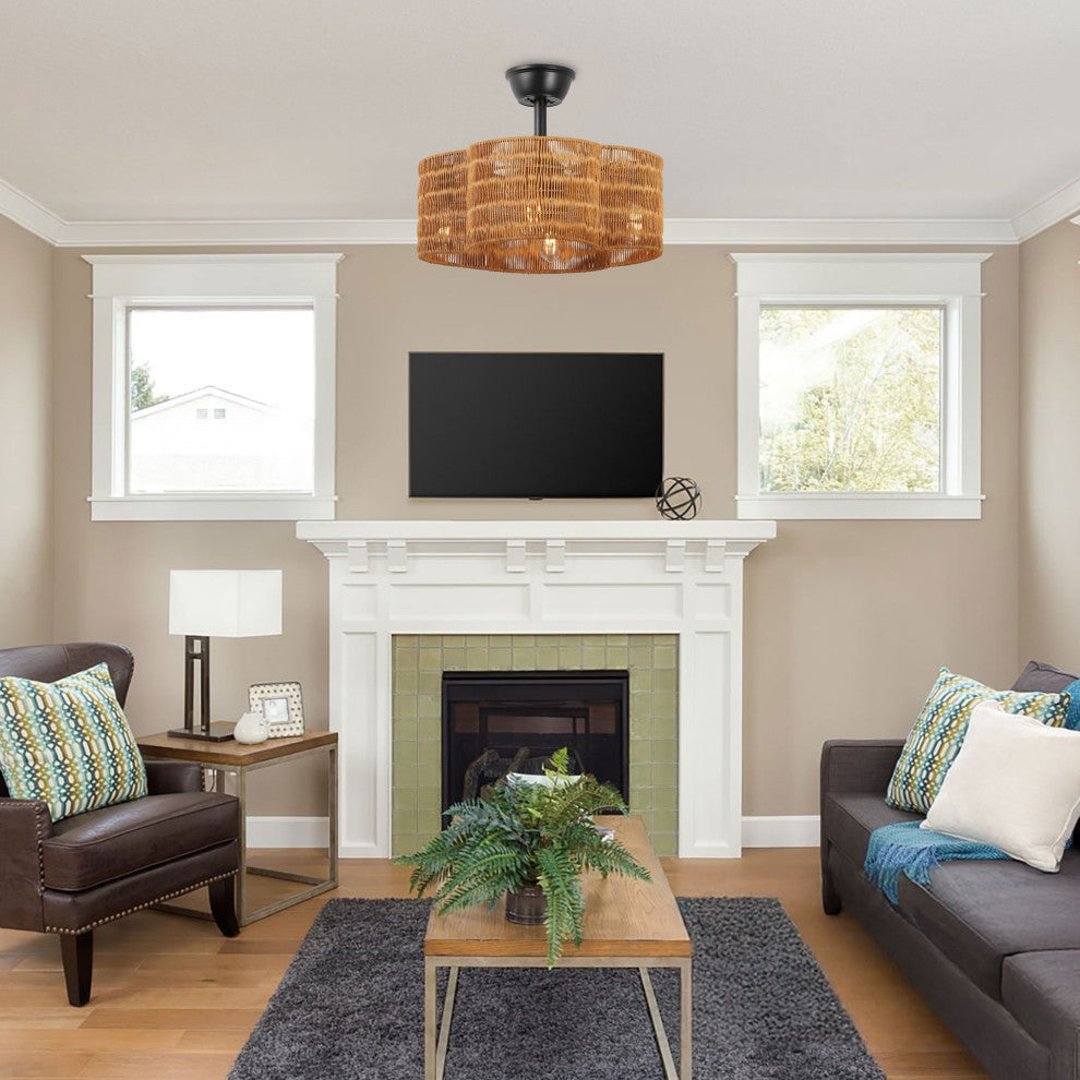Add a touch of natural sophistication to your home with this 4-light handwoven rattan ceiling fan. The scalloped shade delivers an airy handcrafted feel, creating a cozy and inviting ambiance. The clear fan blades provide unobstructed airflow and visual balance. Designed with a powerful, whisper-quiet motor, this fan offers six speed settings and reversible airflow for year-round comfort. Its matte black/gold finish offers a contemporary contrast to the natural materials, making it ideal for spaces like bedrooms, dining areas, or living rooms.Features:Textured woven rattan shade: Offers a timeless aesthetic, adding natural warmth and elegance to any space;Bulb compatibility: Requires four E12 socket bulbs, supporting up to 25W each (bulbs not included);6-speed reversible motor: Delivers customizable airflow and comfort for year-round use;Convenient remote control: Enables independent operation of the fan and light for added flexibility;Adjustable height: Includes two downrods (1x5" and 1x12") to accommodate various ceiling heights;