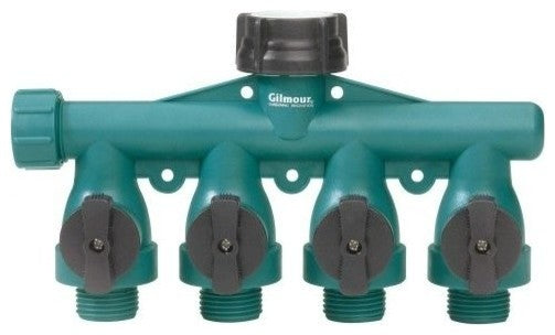 A Gilmour Manifold Connector features 4 Way. 45% More Water Flow, Maximum Water Flow Equals Maximum Performance From Sprinklers and Nozzles. Controls Water Flow For 4 Hoses. Large Handles For Easy Grip and Turn. Easy On Swivel Connector Assures Accurate Connection To Faucet.